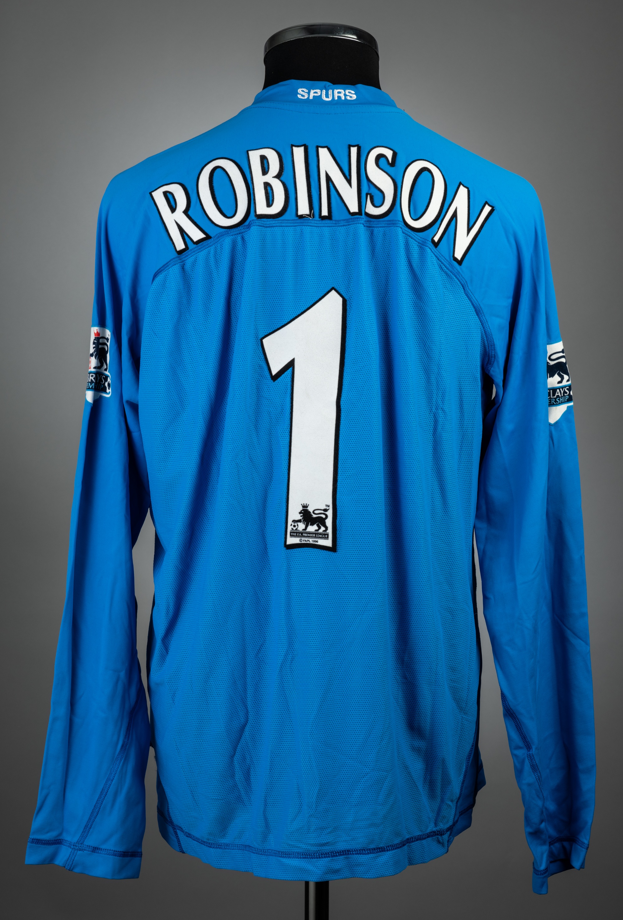 Paul Robinson blue Tottenham Hotspur no.1 goalkeeping jersey, season 2004-05, match issue, Kappa, long-sleeved with BARCLAYS PREMIERSHIP sleeve badges, club crest and sponsor logo, reverse lettered ROBINSON, no size label
