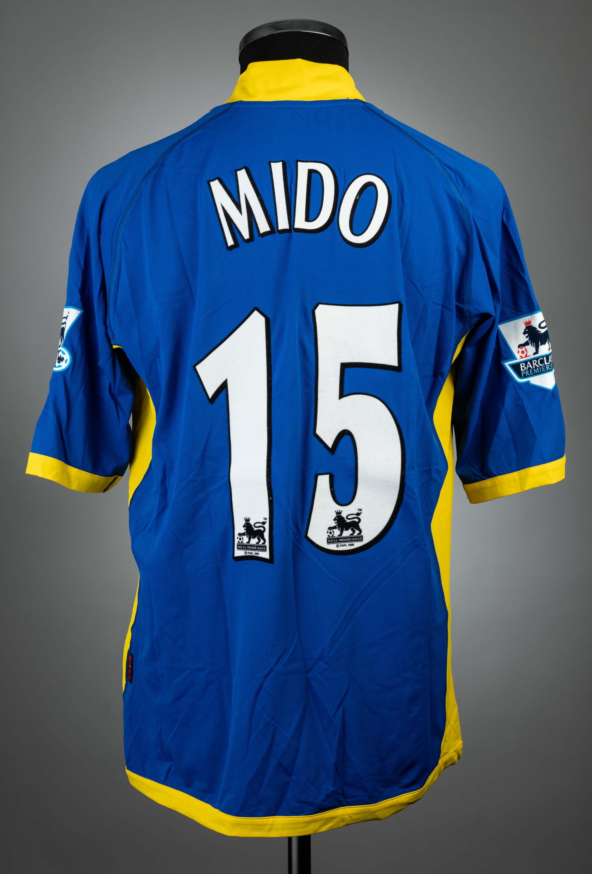 Mido blue and yellow Tottenham Hotspur no.15 away jersey, season 2005-06, match issue, Kappa, short-sleeved with BARCLAYS PREMIERSHIP sleeve badges, club crest and sponsor logo, reverse lettered MIDO, no size label