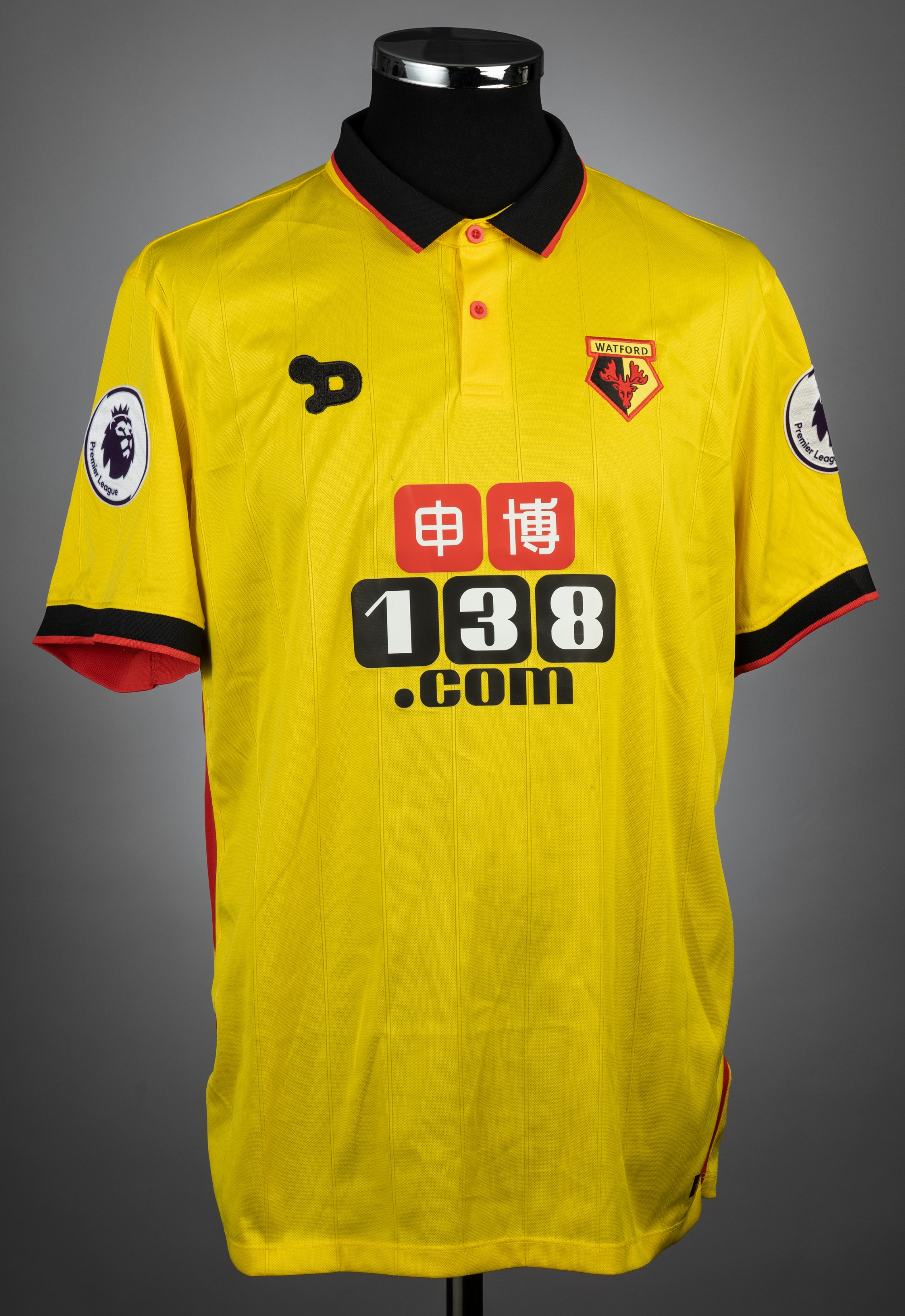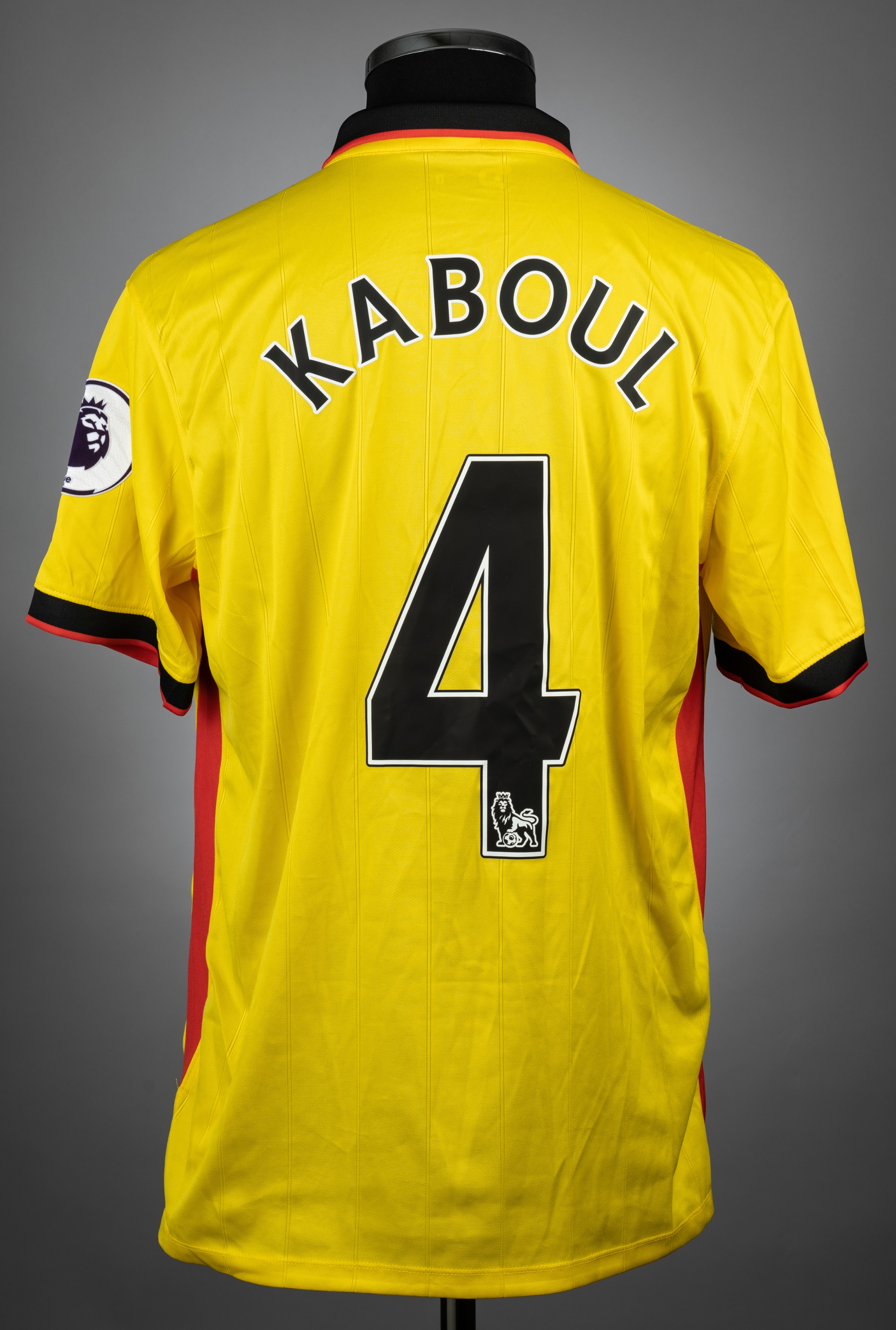 Younes Kaboul yellow, black & red Watford no.4 jersey v Sunderland, played at Vicarage Road, on 1st April 2017, match-issue, Dryworld, short-sleeved with PREMIER LEAGUE sleeve badges, club crest and sponsor logo, reverse lettered KABOUL, size L Watford defeated Sunderland 1-0.