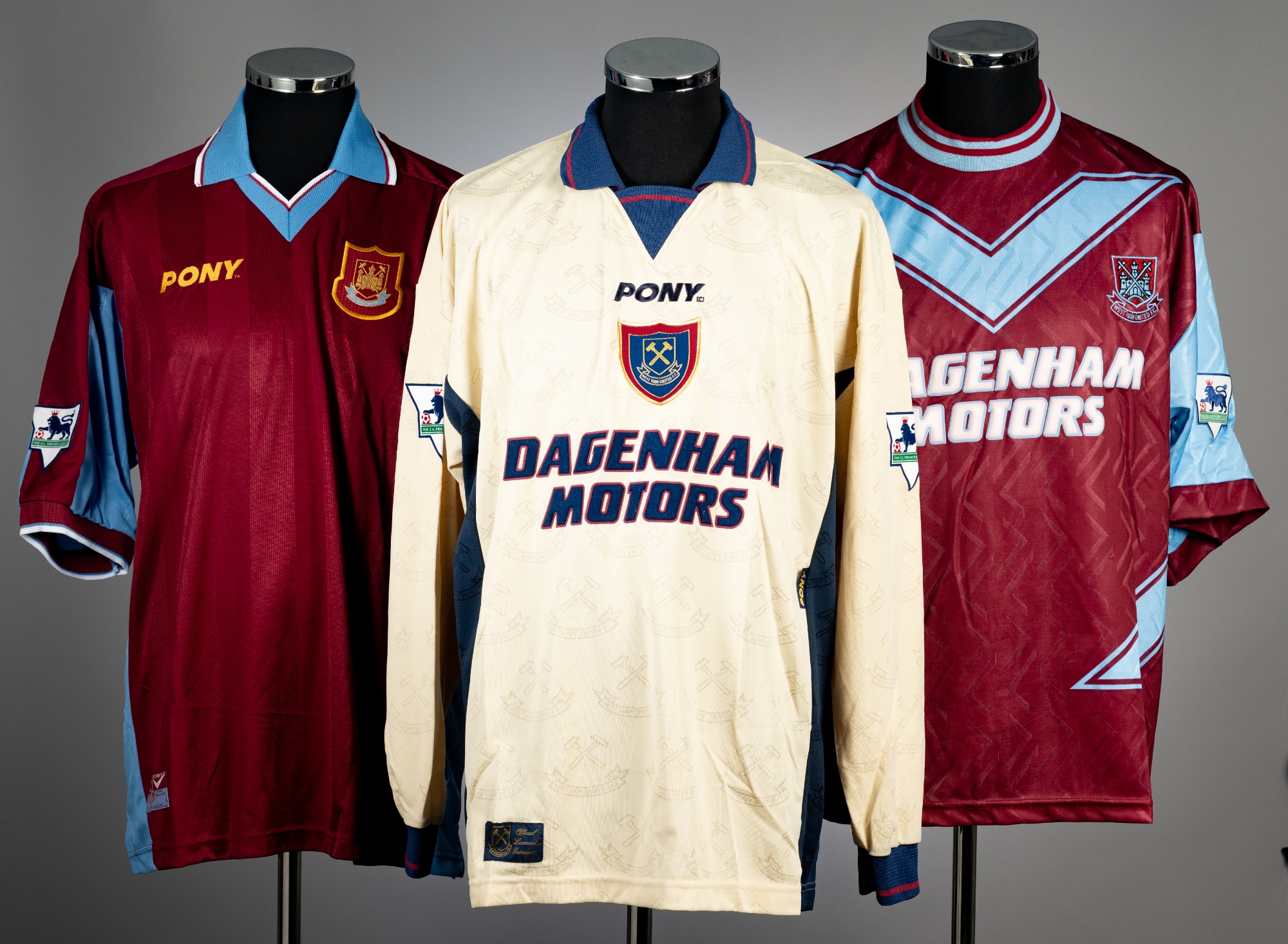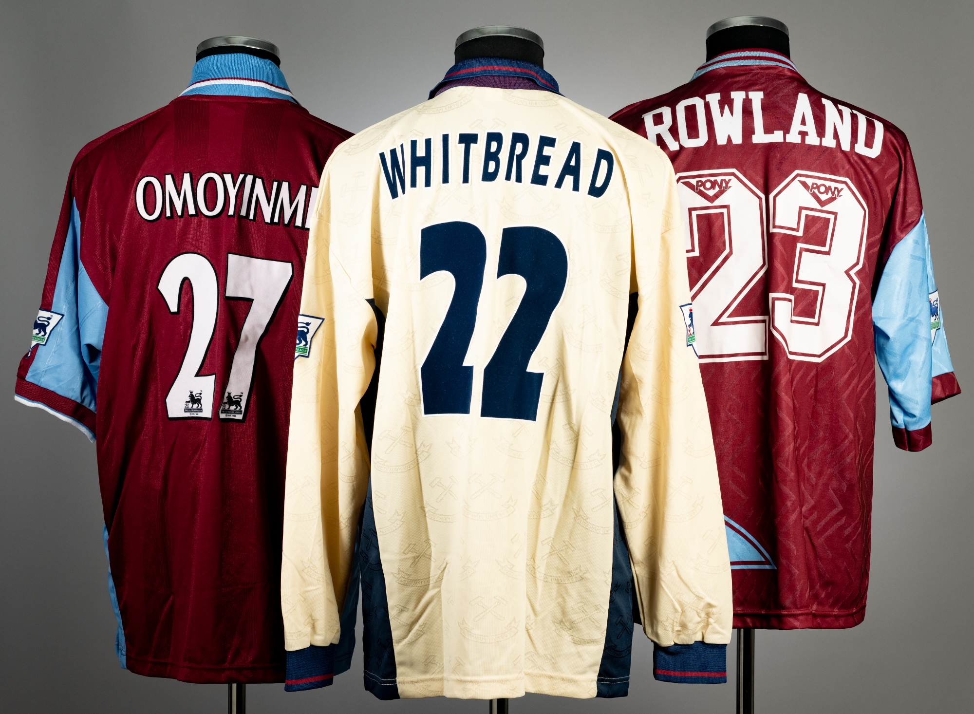 A group of three West Ham United Premier League jerseys, comprising Emmanuel Omoyinmi clart and blue no.27 home jersey; Keith Rowland no.23 home jersey; a gold Adrian Whitbread no.22 away jersey, condition good, (3)