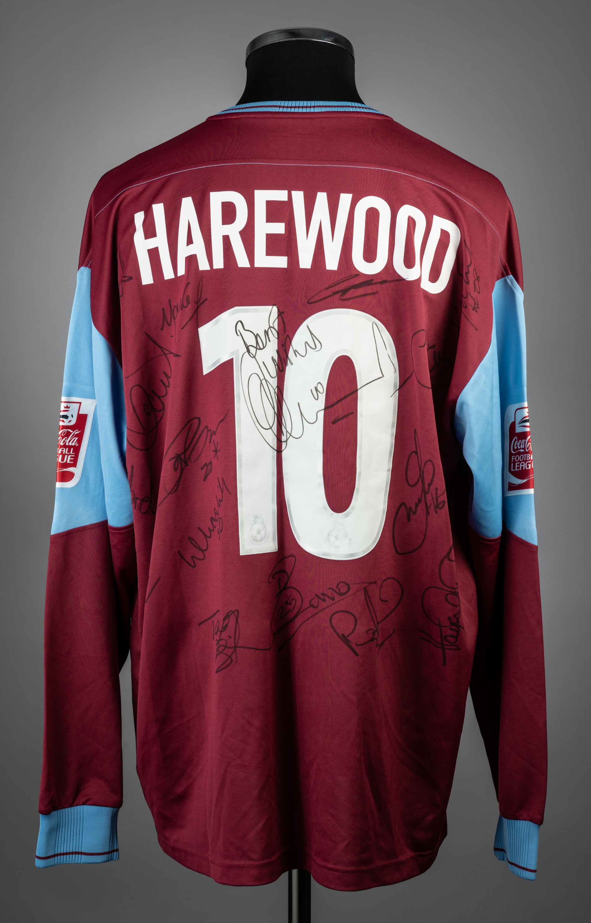 Marlon Harewood squad-signed claret & blue West Ham United no.10 home jersey, season 2004-05, match-issue, Reebok, short-sleeved with COCA COLA FOOTBALL LEAGUE sleeve badges, club crest and sponsor logo, reverse lettered HAREWOOD, size 46/48in., signed in black marker pen to reverse, by 17 squad members approx. including Harewood, Sheringham, Mullins, Zamora, and others