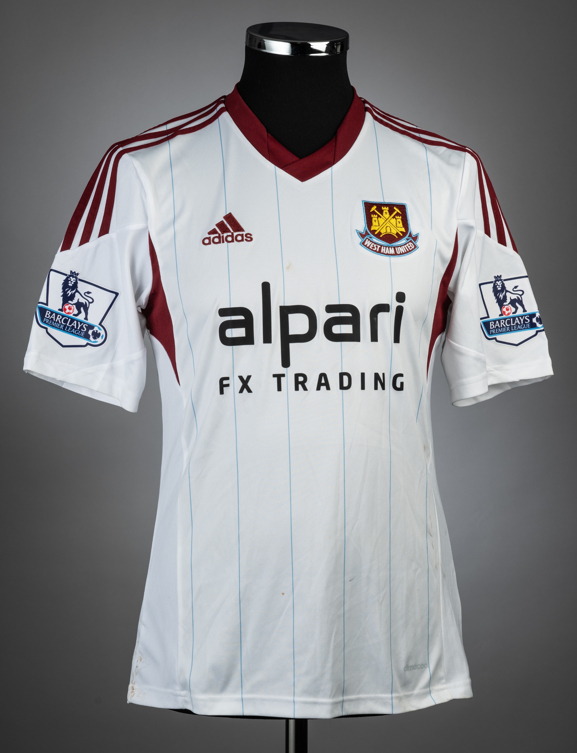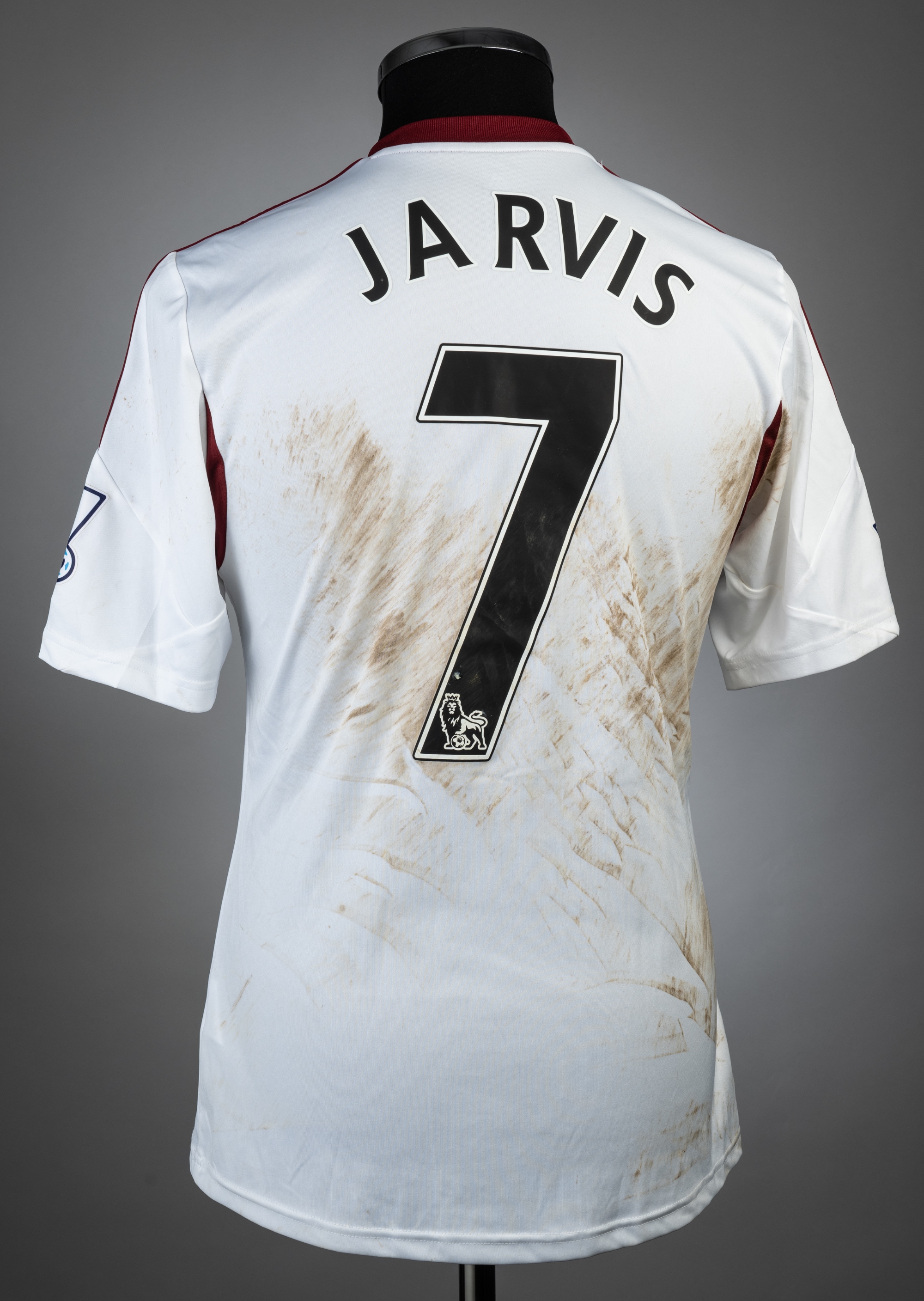 Matt Jarvis white & claret West Ham Untied no.7 away jersey, season 2013-14, match issue, Adidas, short-sleeved with BARCLAYS PREMIER LEAGUE sleeve badges, club crest and sponsor logo, reverse lettered JARVIS, size S, bears extensive pitch marks on reverse, sleeves and front