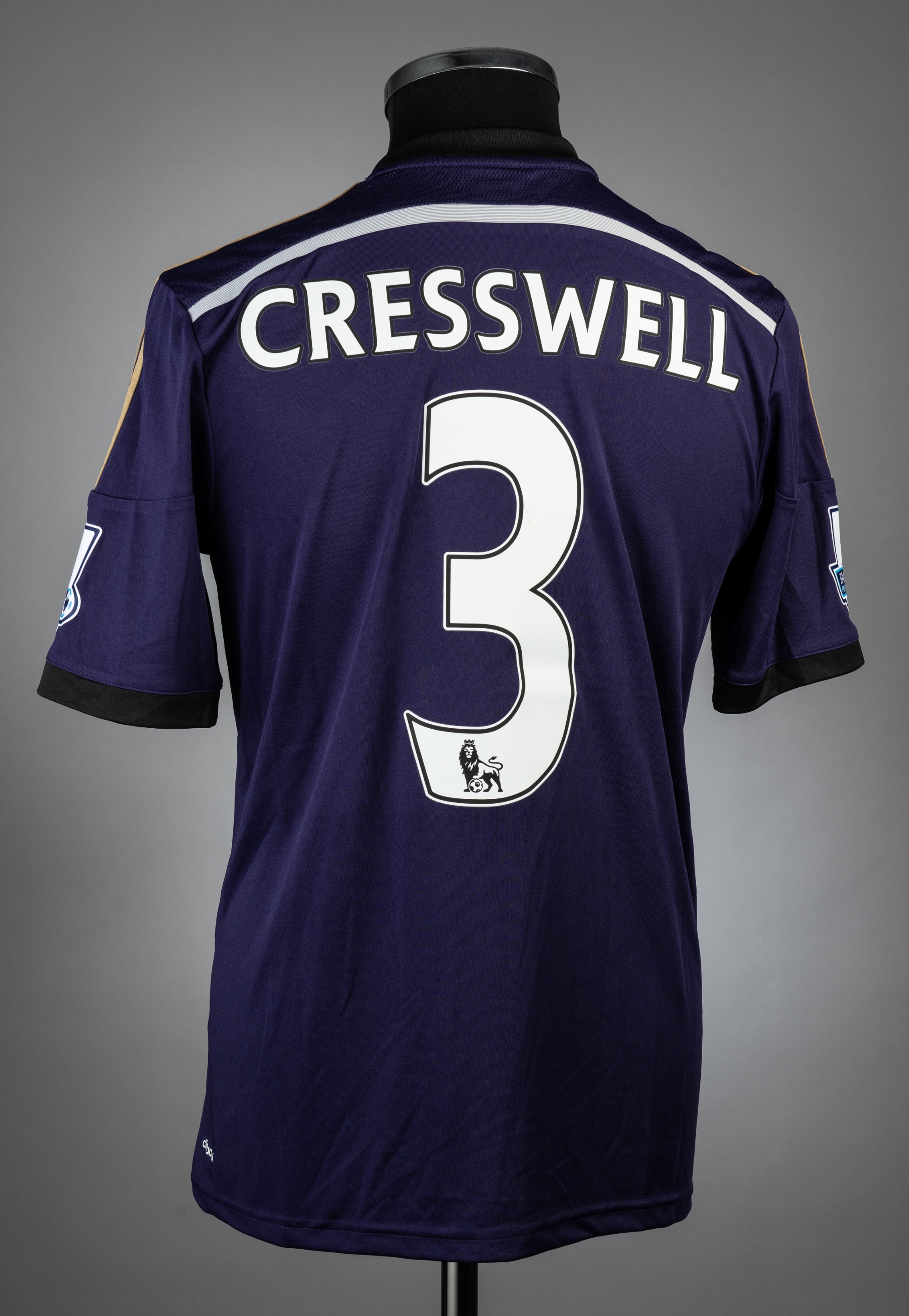 Aaron Cresswell purple, black & gold West Ham United no.3 third choice jersey, season 2014-15, match-issue, Adidas, short-sleeved with BARCLAYS PREMIER LEAGUE sleeve badges, club crest and sponsor logo, reverse lettered CRESSWELL, size S