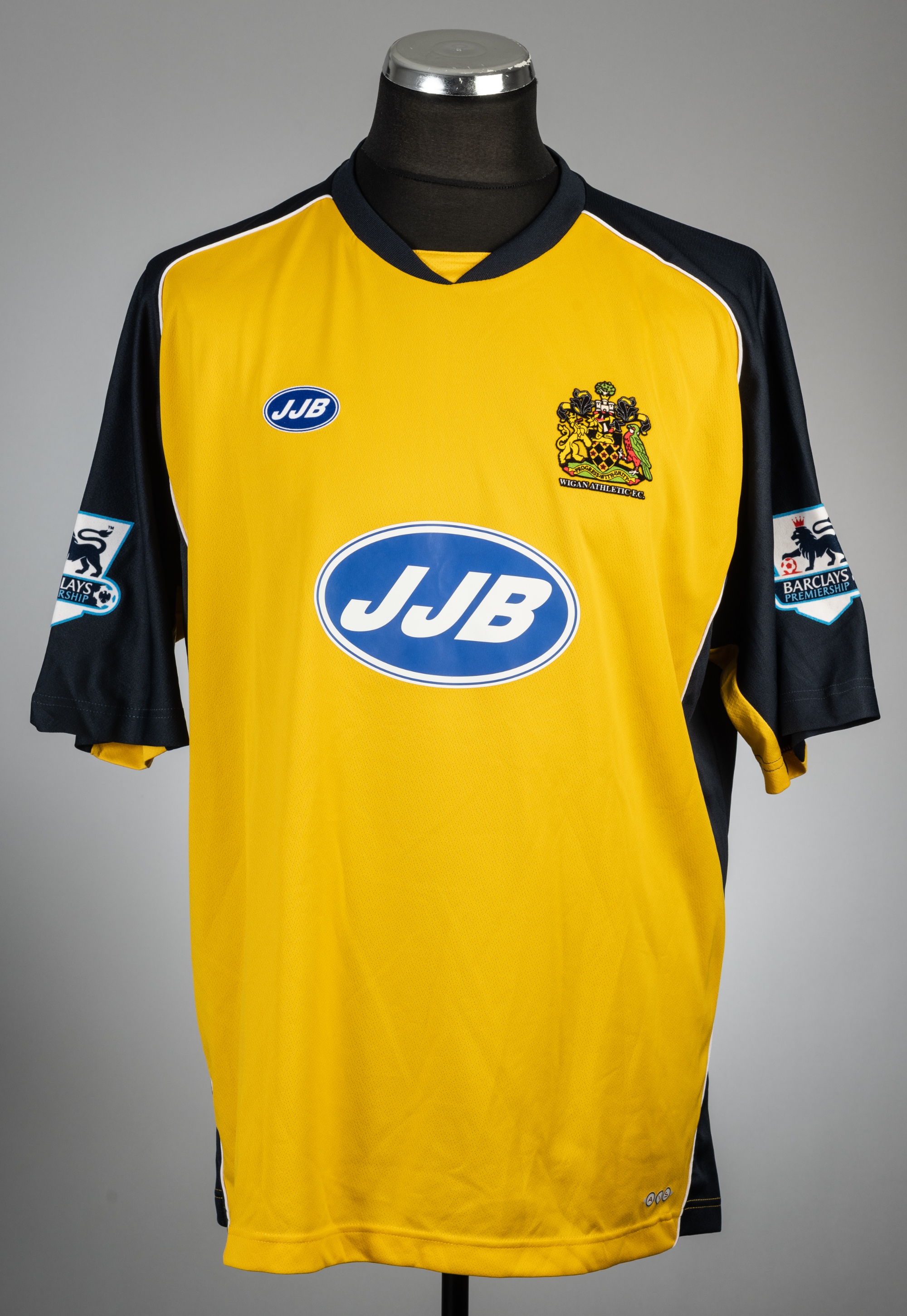 Nathan Ellington yellow and black Wigan Athletic no.9 away jersey, season 2005-06, JJB, short-sleeved with BARCLAYS PREMIERSHIP sleeve badges, club crest and sponsor logo, reverse lettered ELLINGTON, size X-Large