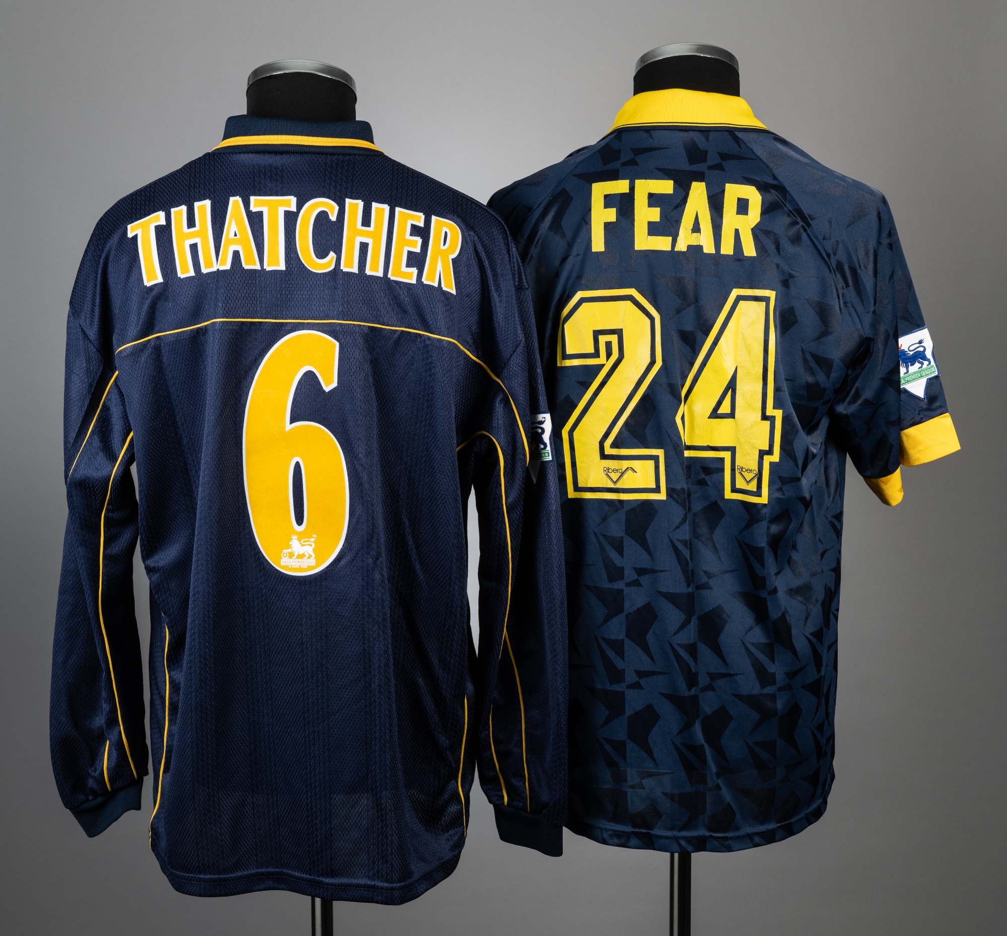 Two Wimbledon Premier League home match jerseys, comprising a Ben Thatcher blue no.6 jersey and a Peter Fear blue no.24 jersey, (2)