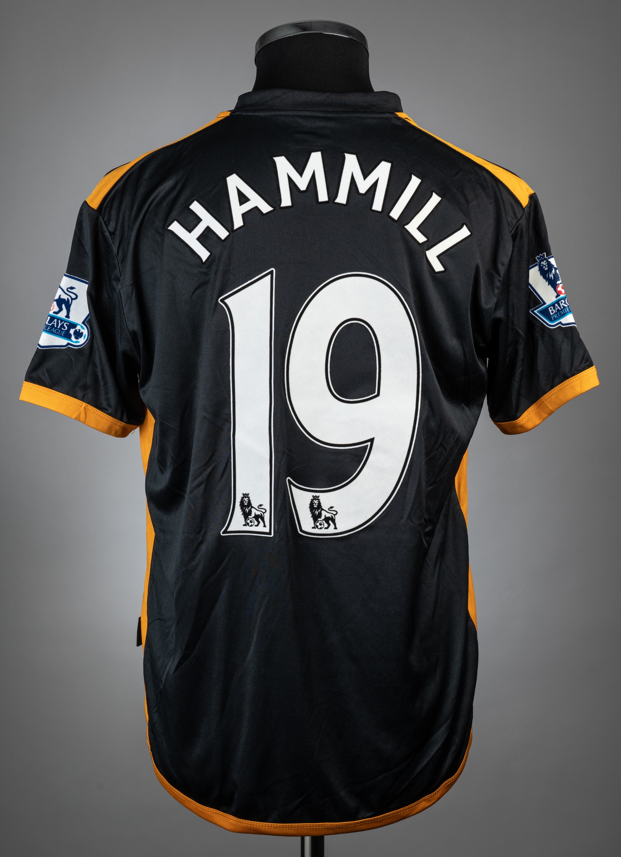 Adam Hammill black & orange Wolverhampton Wanderers no.19 jersey v Manchester City, played at Etihad Stadium, on 29th October 2011, match-issue, Burrda, short-sleeved with BARCLAYS PREMIER LEAGUE sleeve badges, club crest and sponsor logo, reverse lettered HAMMILL, size M Manchester City defeated Wolverhampton Wanderers 3-1, with Hammill substituted on in the 68th minute.