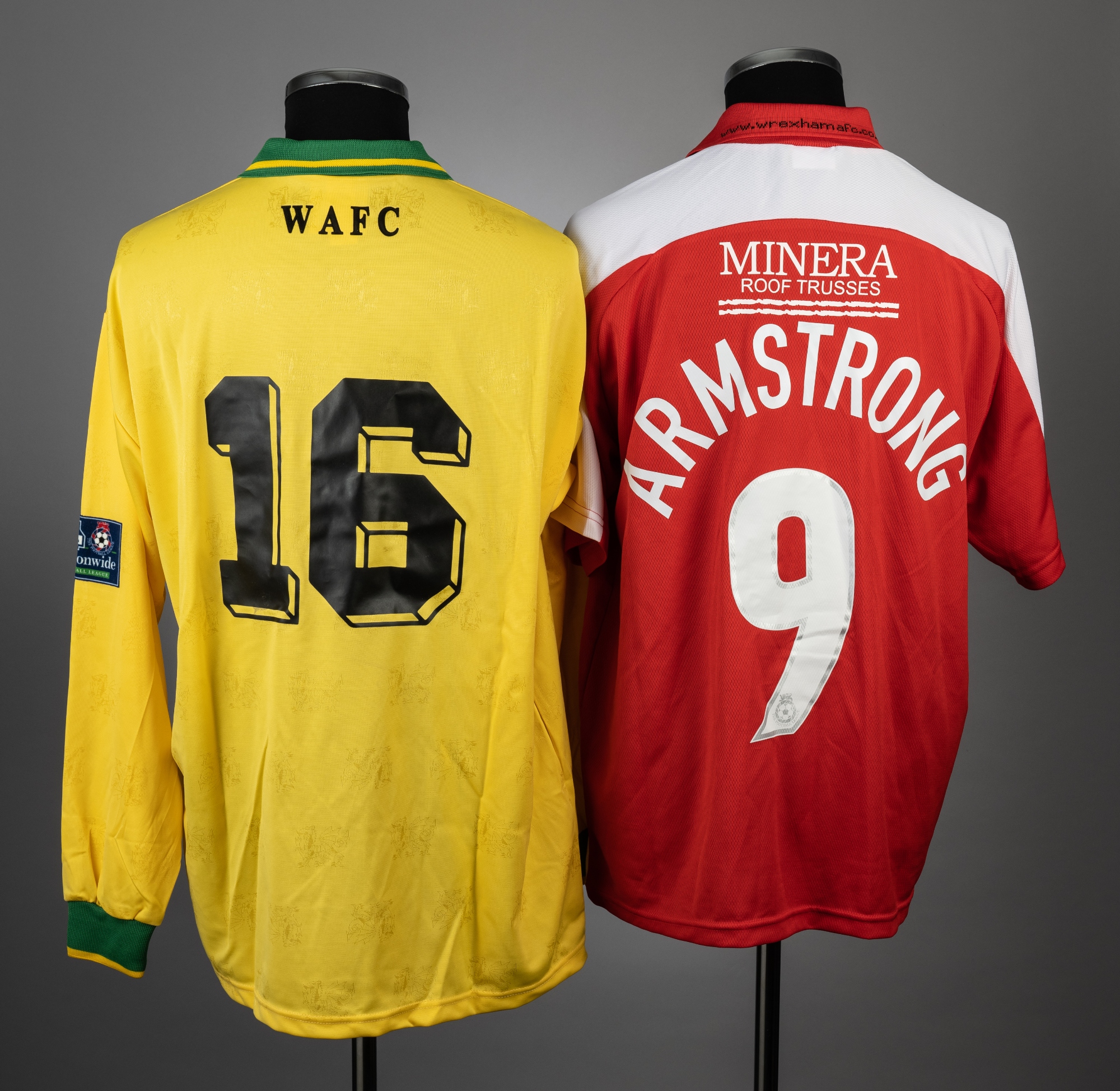 Two Wrexham match jerseys, the first a Chris Armstrong red no.9 for the LDV Final v Southend United at the Millennium Stadium, 10th April 2005; the second yellow no.16 away jersey, season 1997-98, (2)