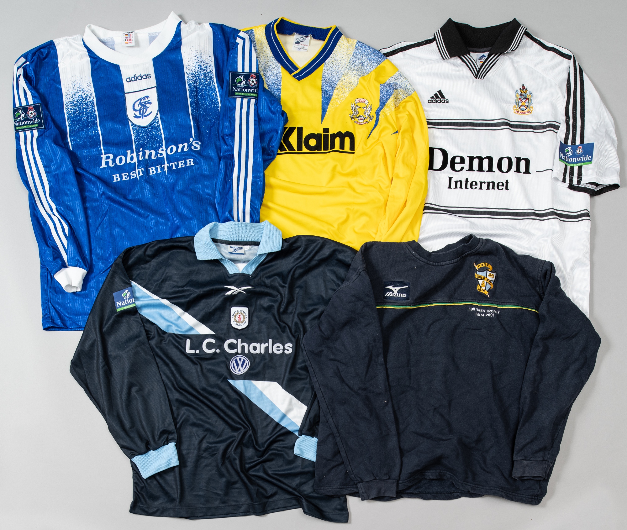 Four Nationwide Football League match jerseys, comprising Paul Hughes black and blue Crewe Alexandra no.42 away jersey; Aaron Hughes white and black Fulham no.30 home jersey; blue Stockport County no.16 unnamed home jersey; yellow Leyton Orient no.16 unnamed away jersey; sold together with a Port Vale training top for the LDV Vans Trophy Final 2001, (5)