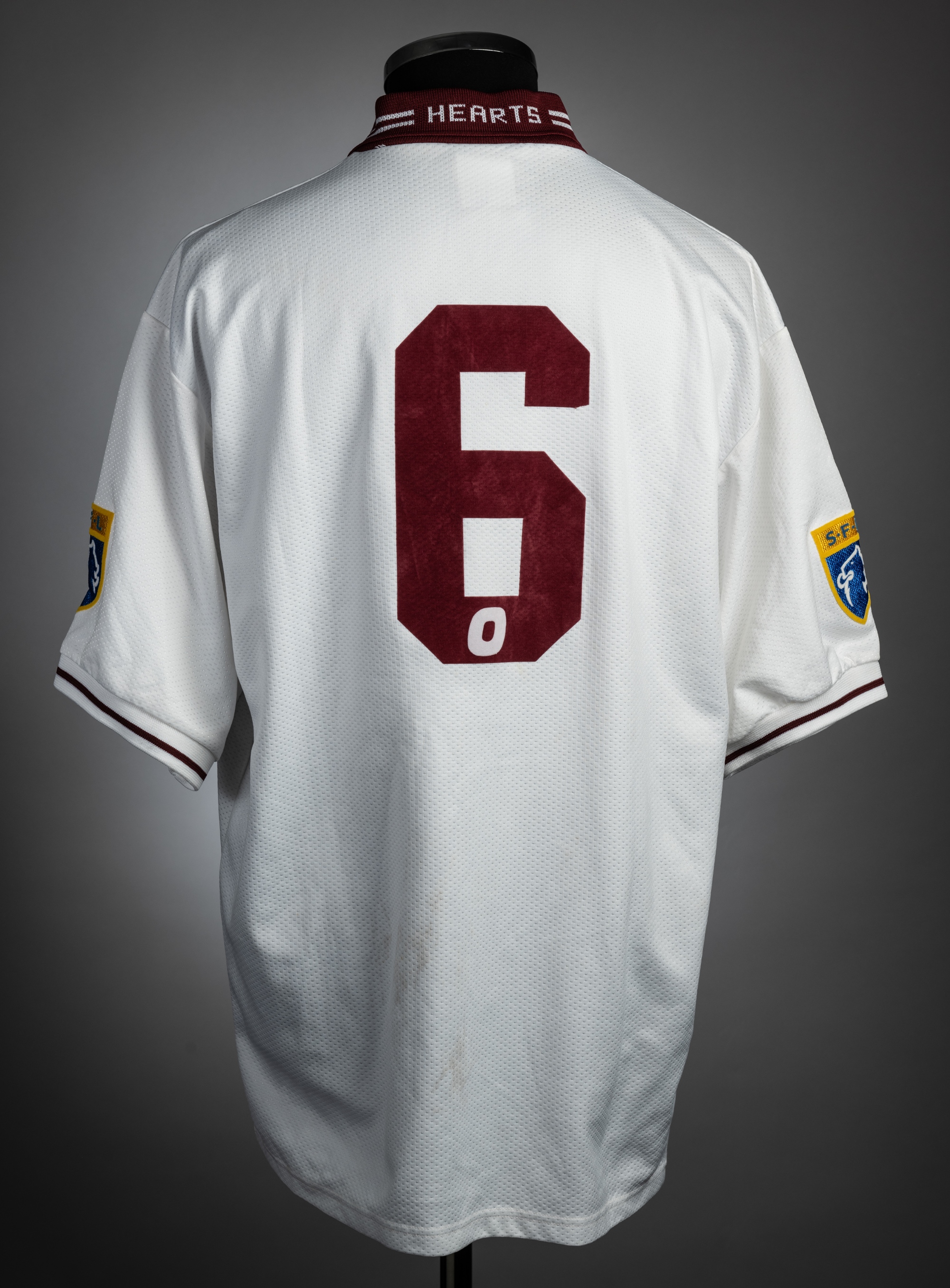 Squad signed white & claret Hearts no.6 away jersey, season 1997-98, match-issue, Olympic Sportswear, short-sleeved with SFL sleeve badges, club cres