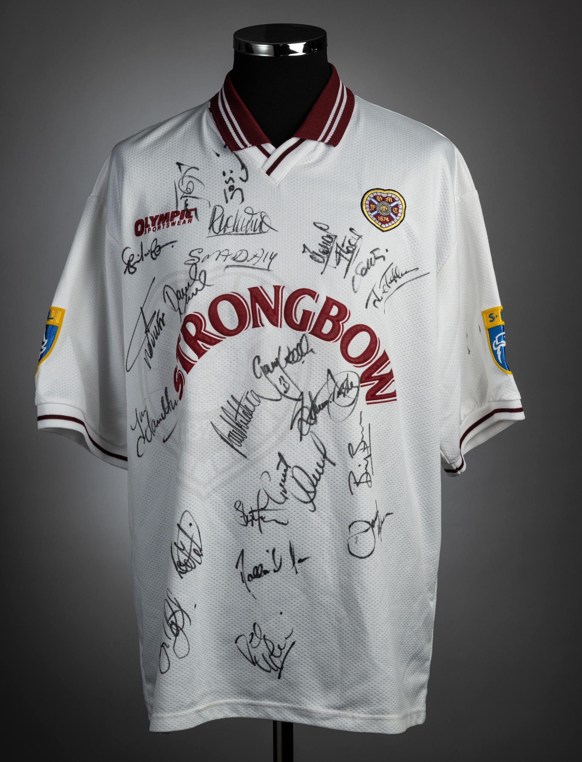 Squad signed white & claret Hearts no.6 away jersey, season 1997-98, match-issue, Olympic Sportswear, short-sleeved with SFL sleeve badges, club crest and sponsor logo, reverse numbered 6, size XXL, signed in black marker pen to front by approximately 23 squad members including Jim Jefferies (manager), Hamilton, Ritchie, Murray, Hogarth, Makel, and others.
