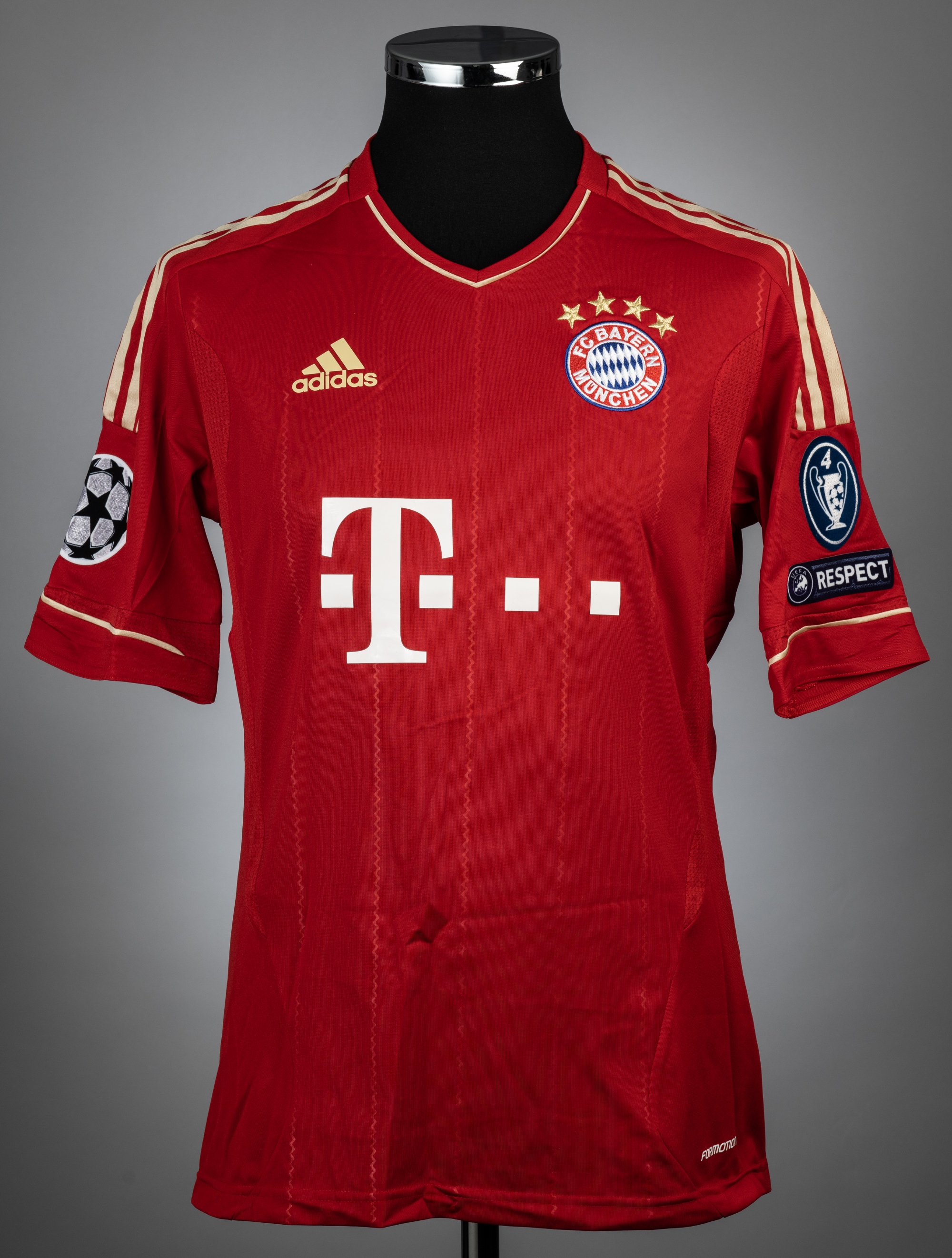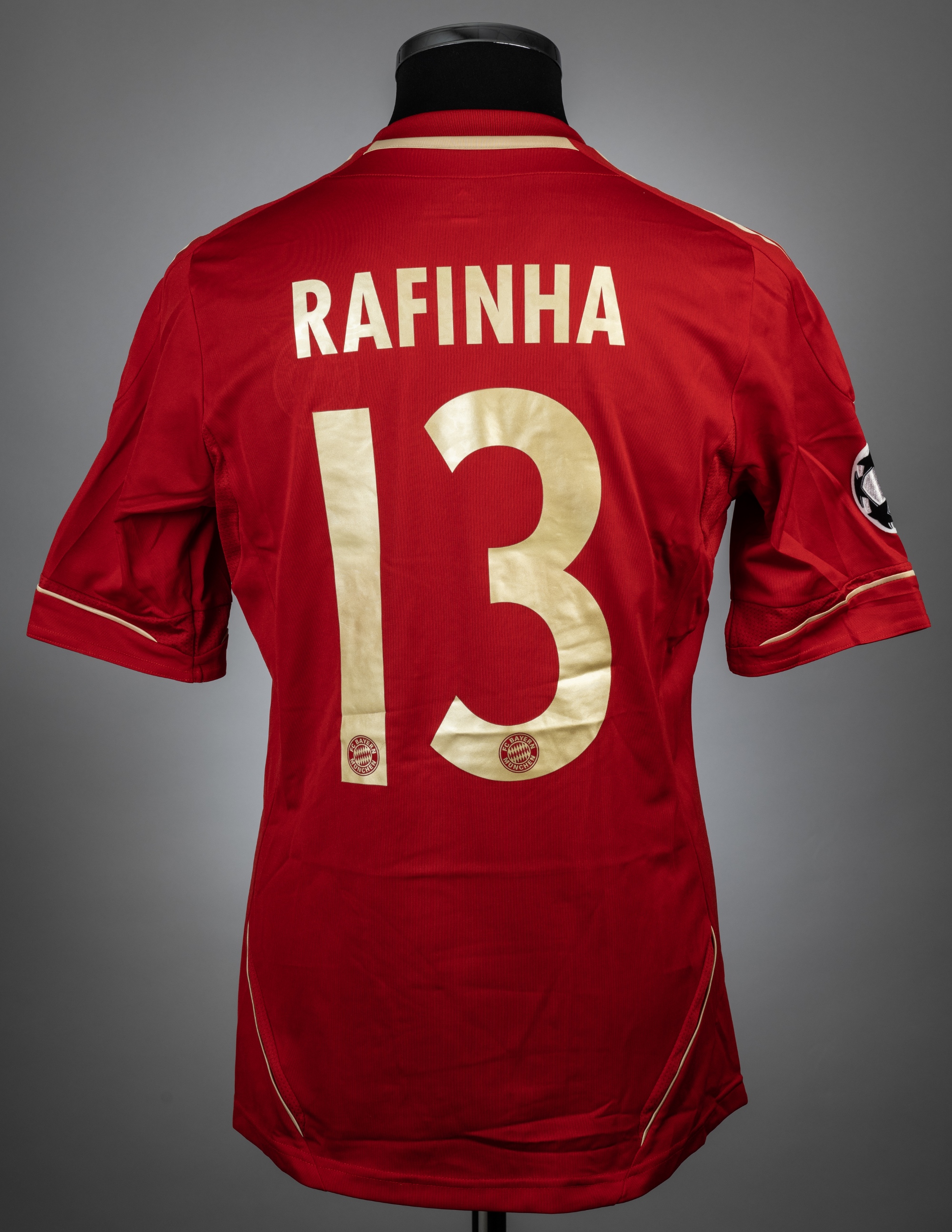 Rafinha red & gold Bayern Munich UEFA Champions League no.13 jersey v Manchester City, season 2011-13, match-issue, Adidas, short-sleeved with UEFA STARBALL, RESPECT and WINNERS sleeve badges, club crest and sponsor logo, reverse lettered RAFINHA, size M, applied lettering, number are tacky