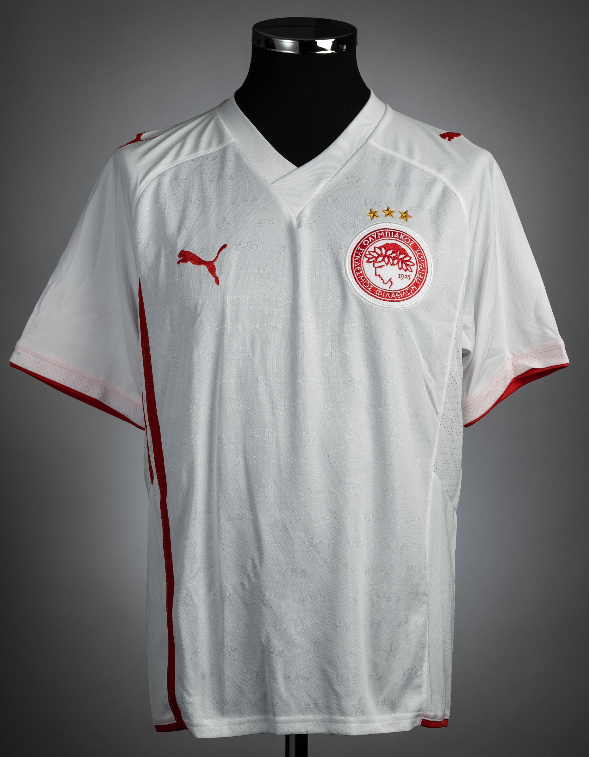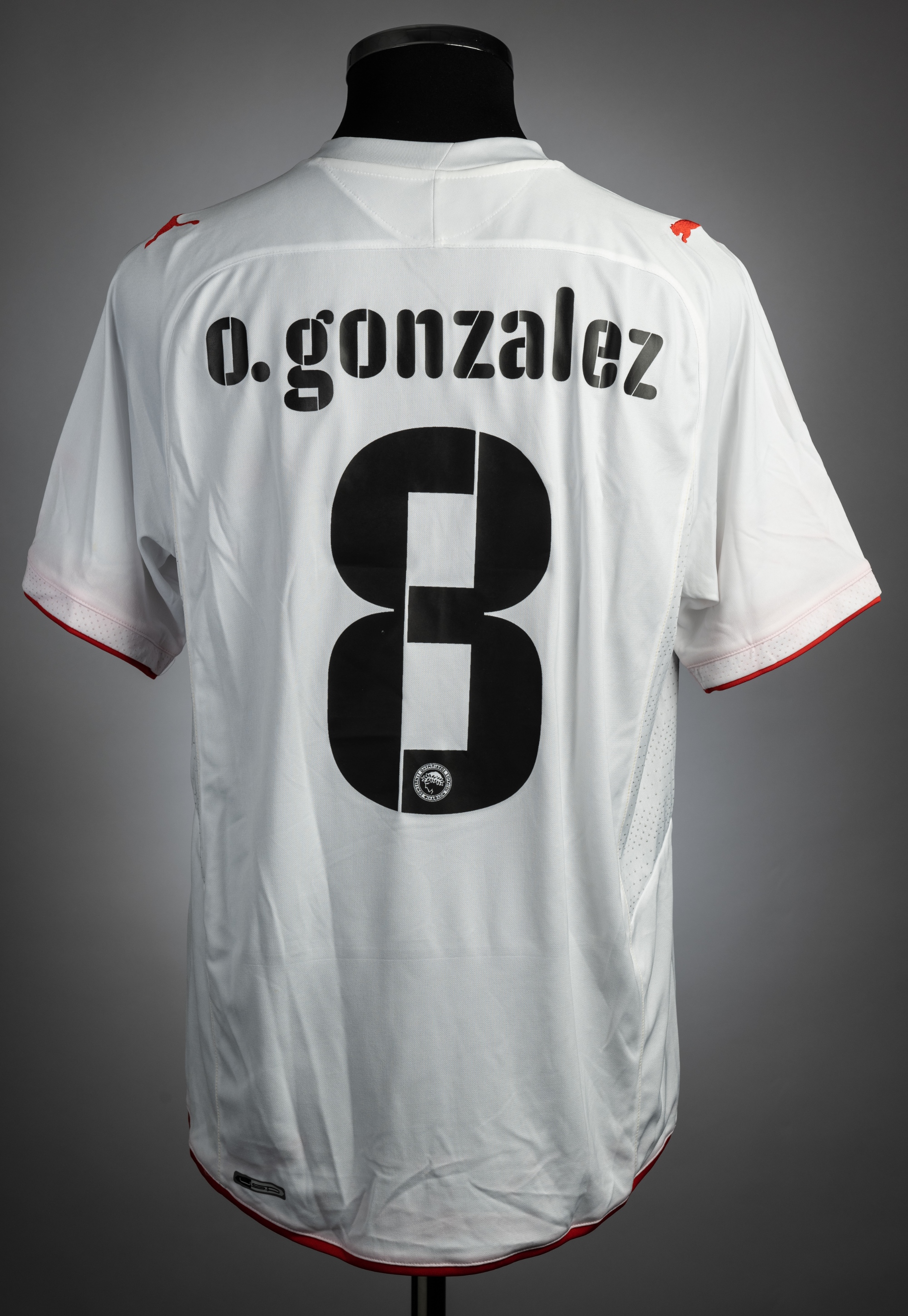 Oscar Gonzalez white & red Olympiacos no.8 jersey, season 2008-09, match-issue, Puma, short-sleeved with No sleeve badges, club crest, reverse lettered O. GONZALEZ, size L, slight colour run on sleeves