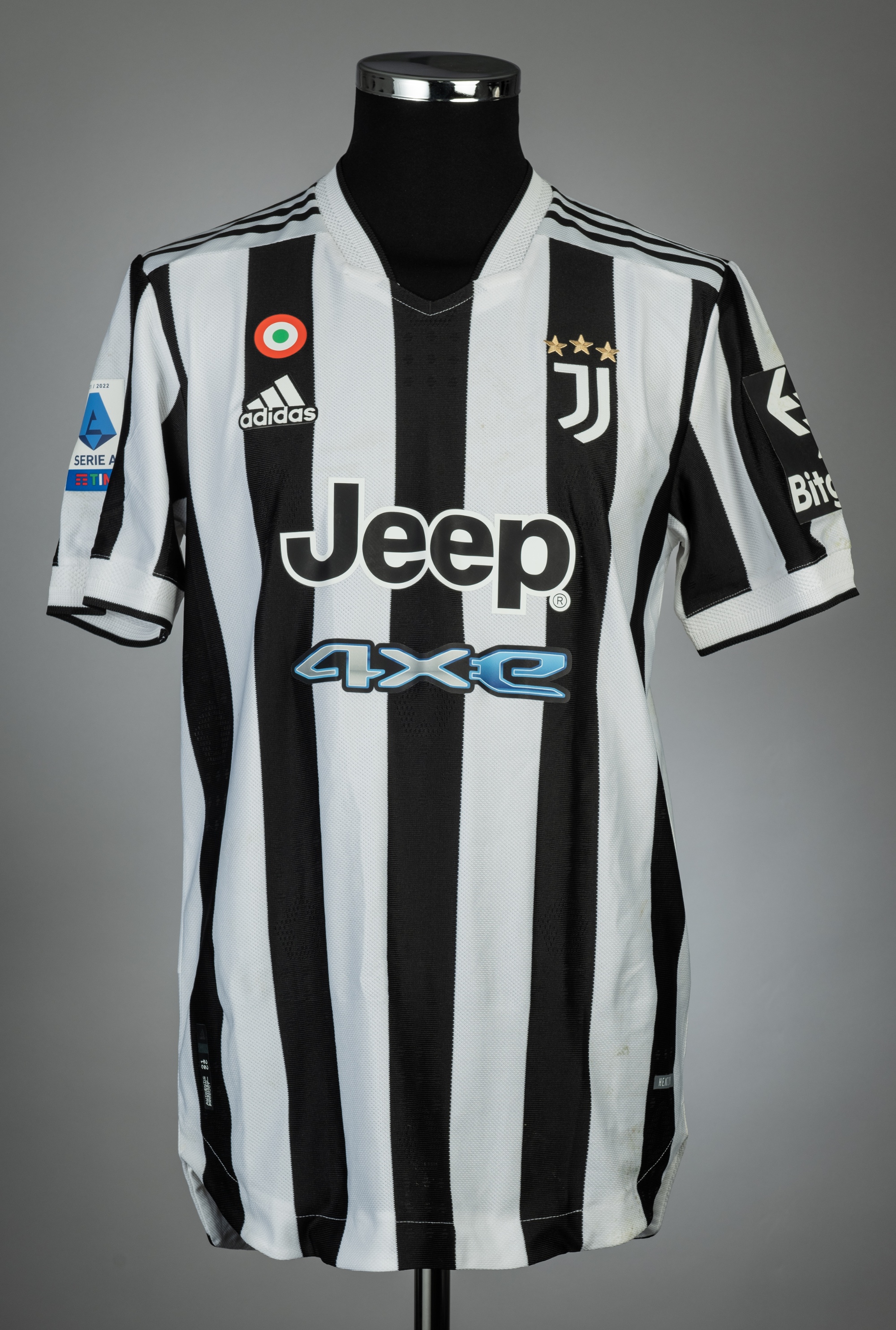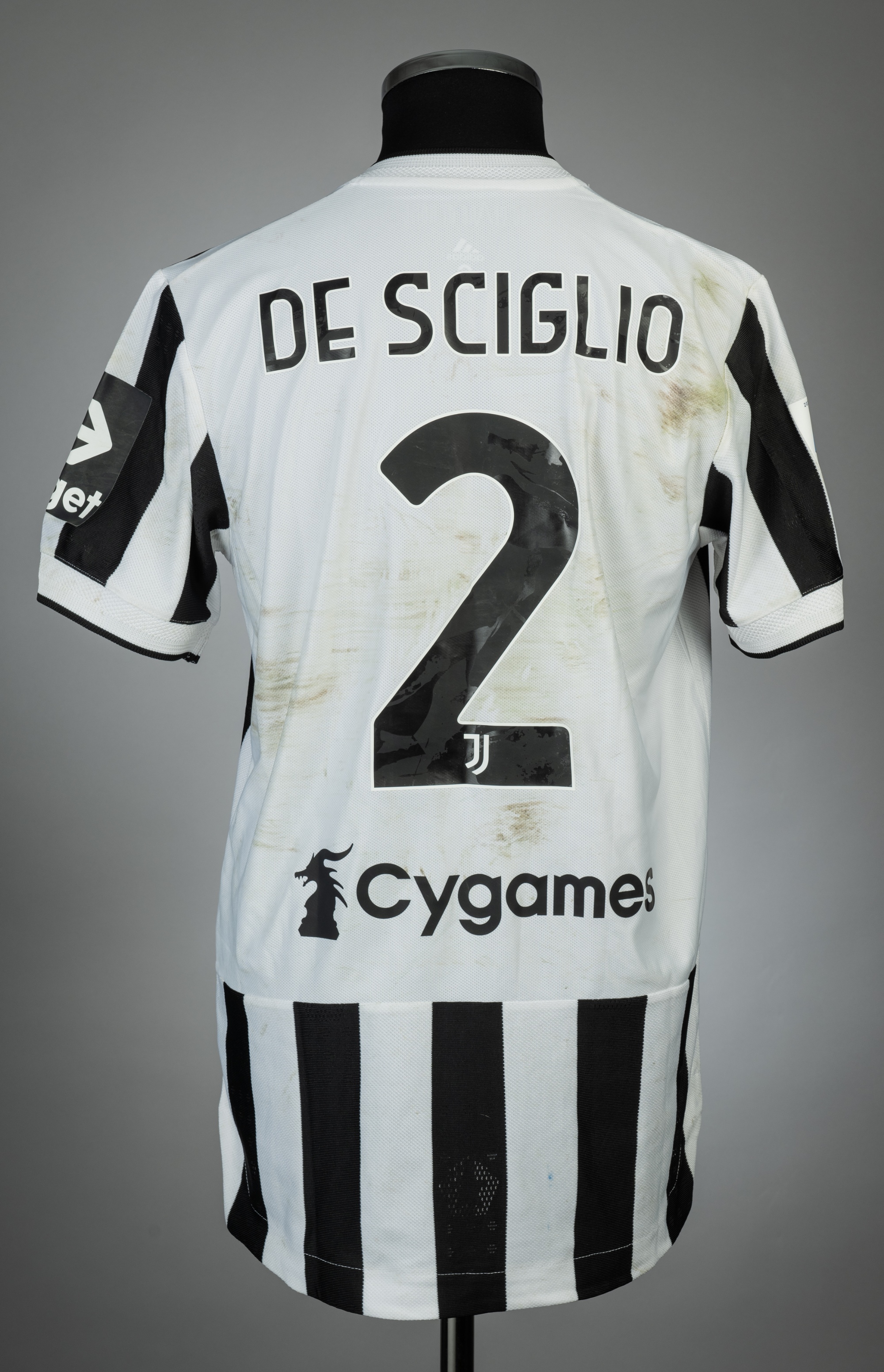Mattia De Sciglio white & black Juventus no.2 jersey v Atalanta, played at Gewiss Stadium, 13th February 2021, match worn, Adidas, short-sleeved with 2021 / 2022 SERIE A TIM and BITGET sleeve badges, club crest and sponsor logo, reverse lettered DE SCIGLIO, size 6, bears pitch stains, sold with three images of the player wearing the jersey during the match, (4) This fixture resulted in a 1-1 draw.
