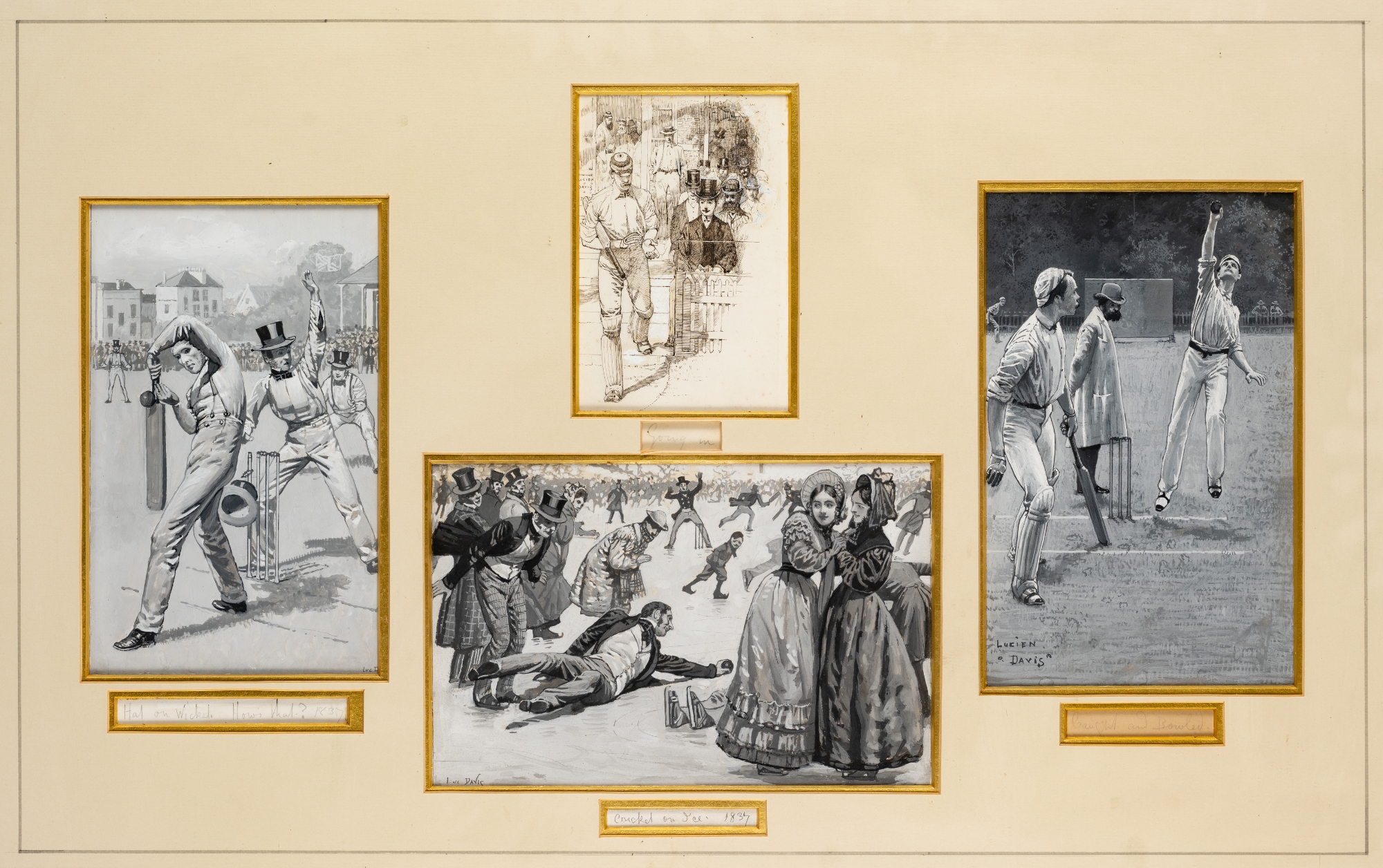 Lucien Davis (British, b.1860) four grisaille drawings of cricket scenes, dated 1837, each titled and signed by the artist, includes 'Caught & Bowled', 25 by 15cm., 'Cracked on Ice', dated 1837, 16 by 25cm.; 'Hat on wicket, How's that?' dated 1837, 23 by 14cm.; 'Going In', 15.5 by 10cm., each under an overall mount, glazed and framed, overall 55 by 81cm.
