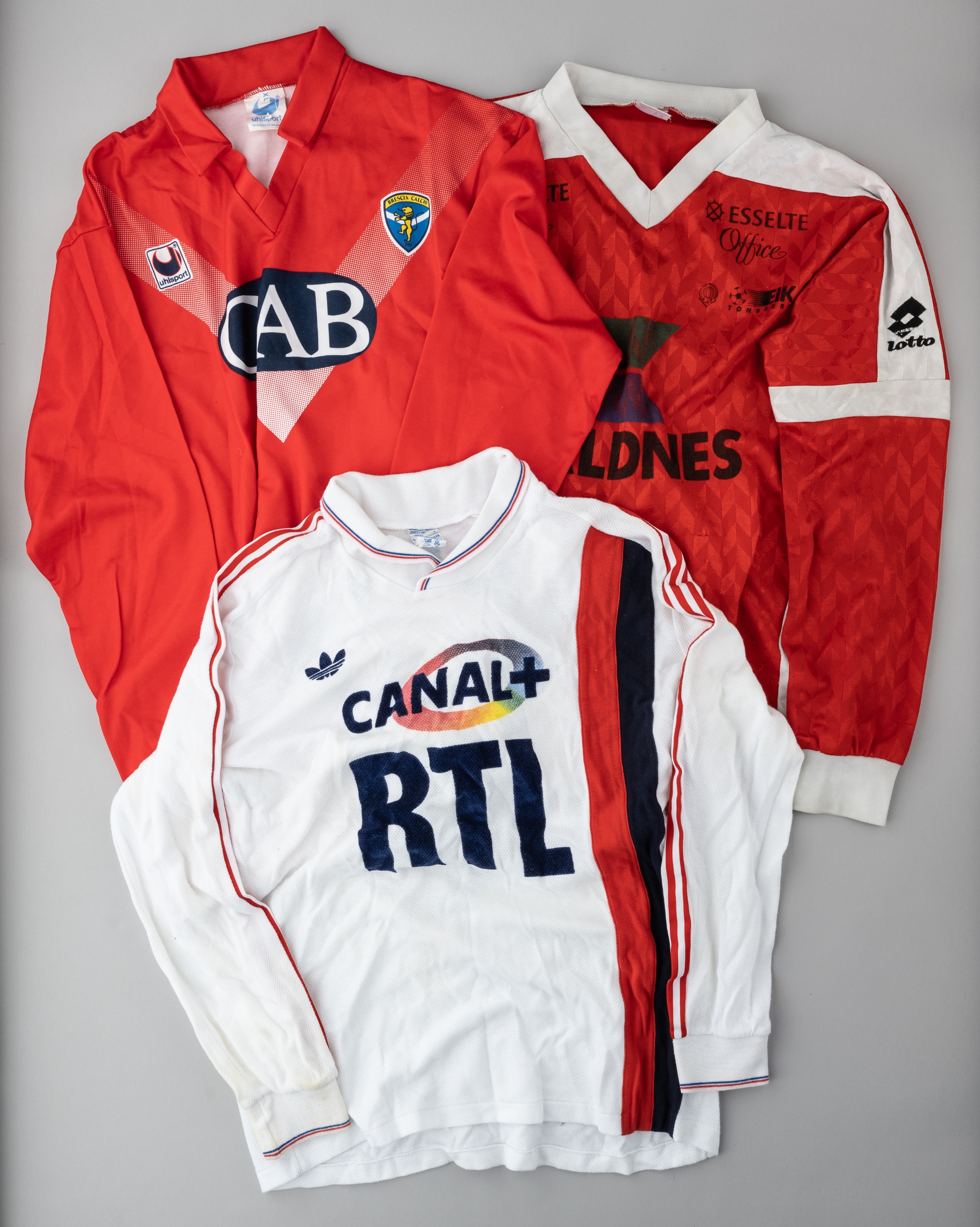 Three Continental clubs match jerseys, comprising a white PSG no.9 away unnamed jersey, with Canal + RTL sponsor logo; red Calcio Brescia no.15 jersey, understood to have been issued to the Romanian footballer Sabau and relating to the Anglo-Italian Cup; red EIK-Tonsberg no.11 jersey, (3)