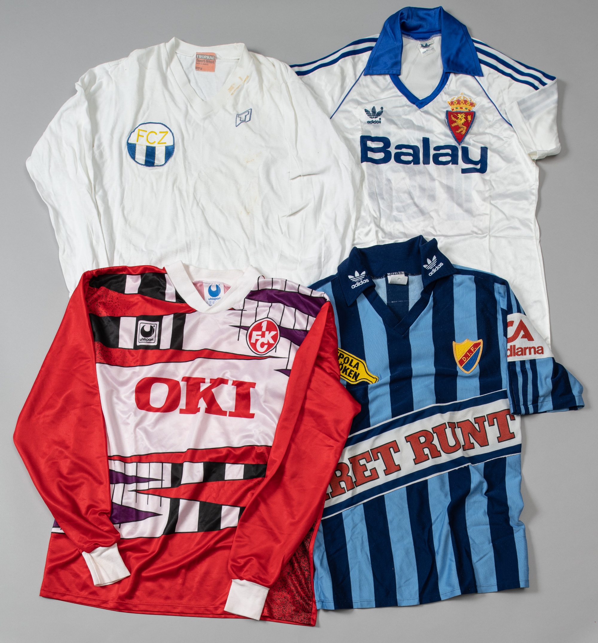 Four Continental Club match jerseys, comprising a red and multi patterned FC Kaiserslautern no.2 home jersey; a white and blue Real Zaragoza no.18 jersey; a dark and light blue striped Djurgarden IF no.6 jersey, believed to have been worn by Tom Svensson; white FC Zurich no.14 jersey, (4)