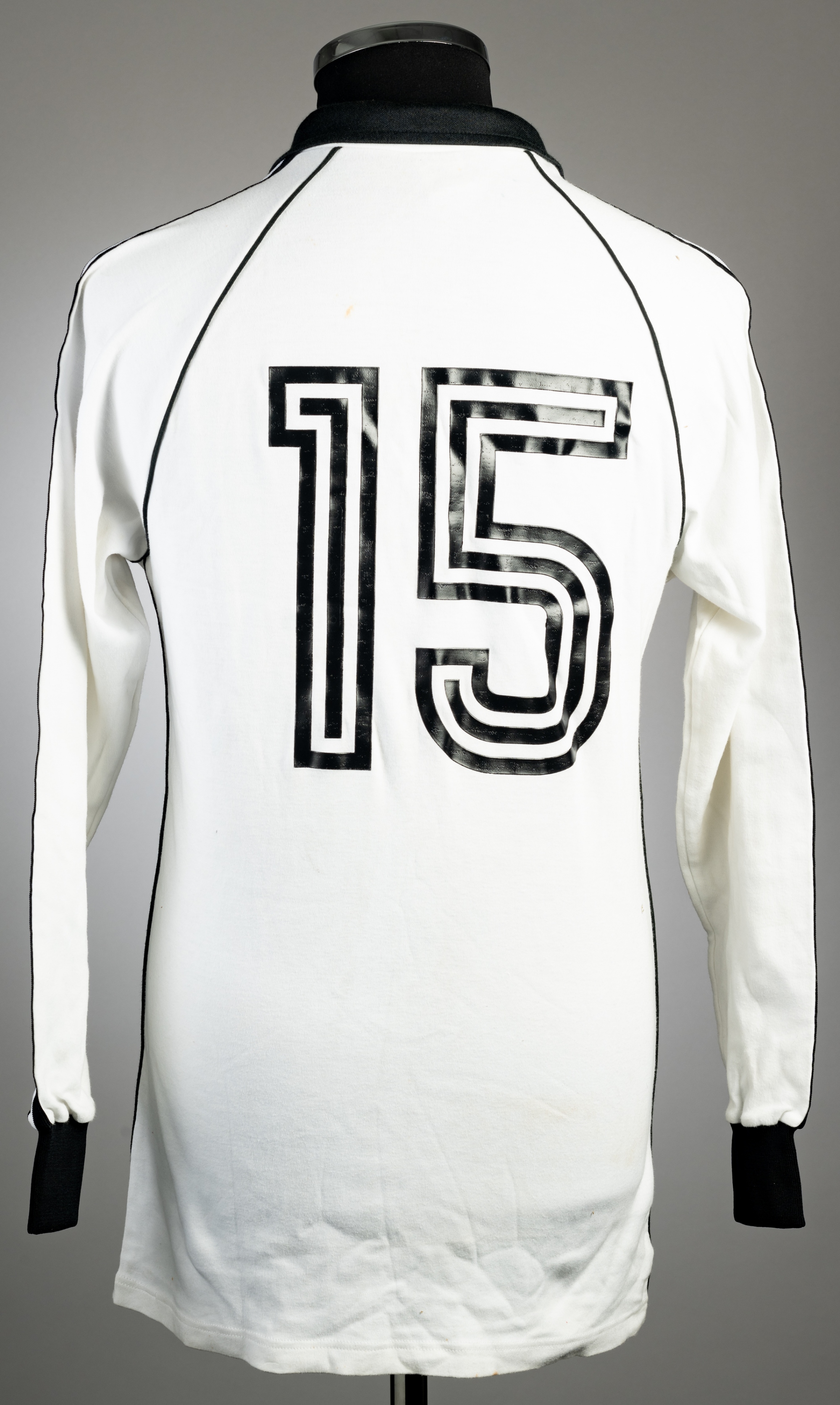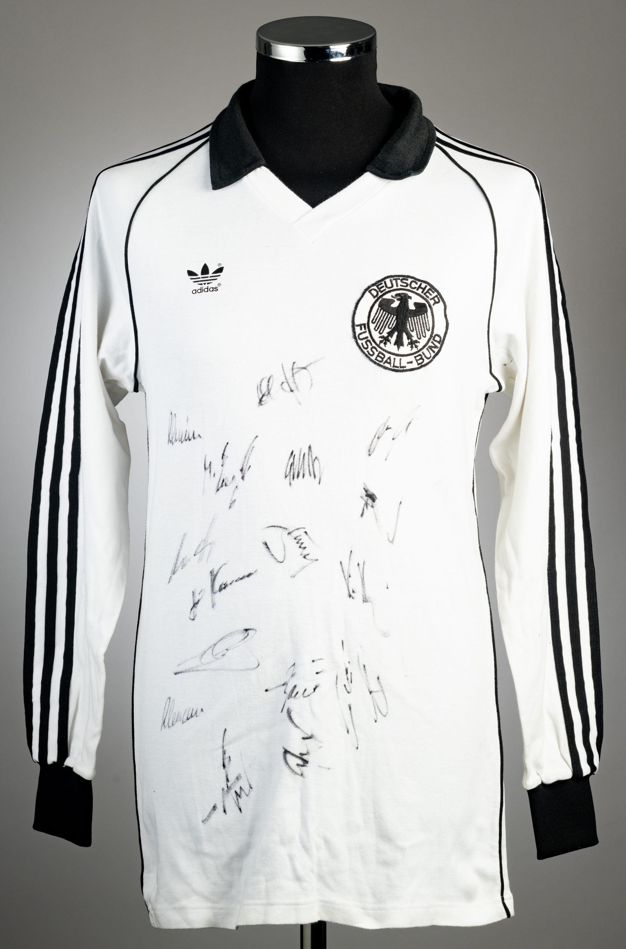 A team-signed white West Germany No.15 jersey circa 1982, Adidas, long-sleeved, with national emblem, size L, signed in black marker pen on the front with approximately 16 signatures, good condition with some stains on the bottom seam body The autographs on this shirt remain unidentified. They are not those of the senior national team of this time.