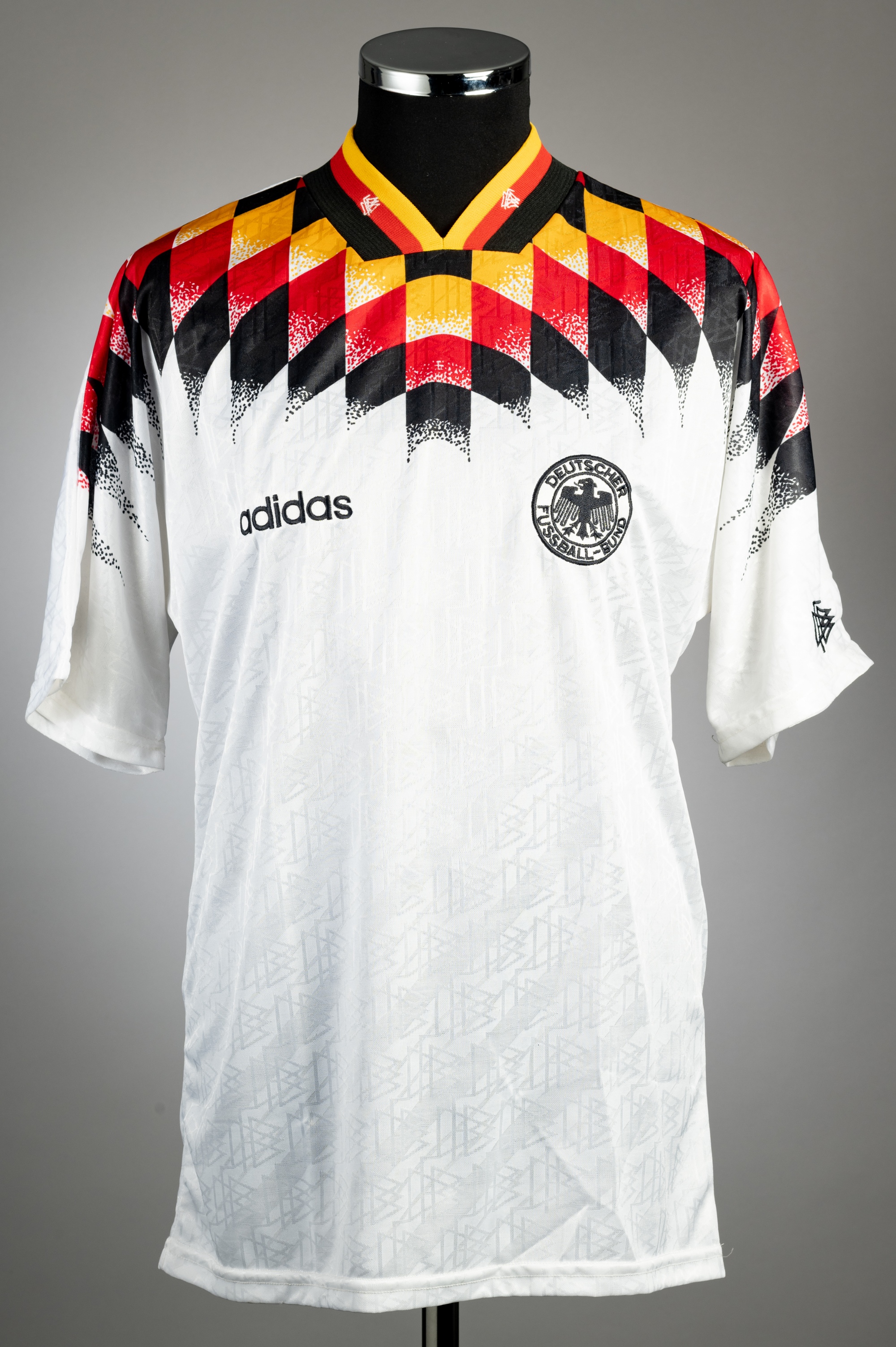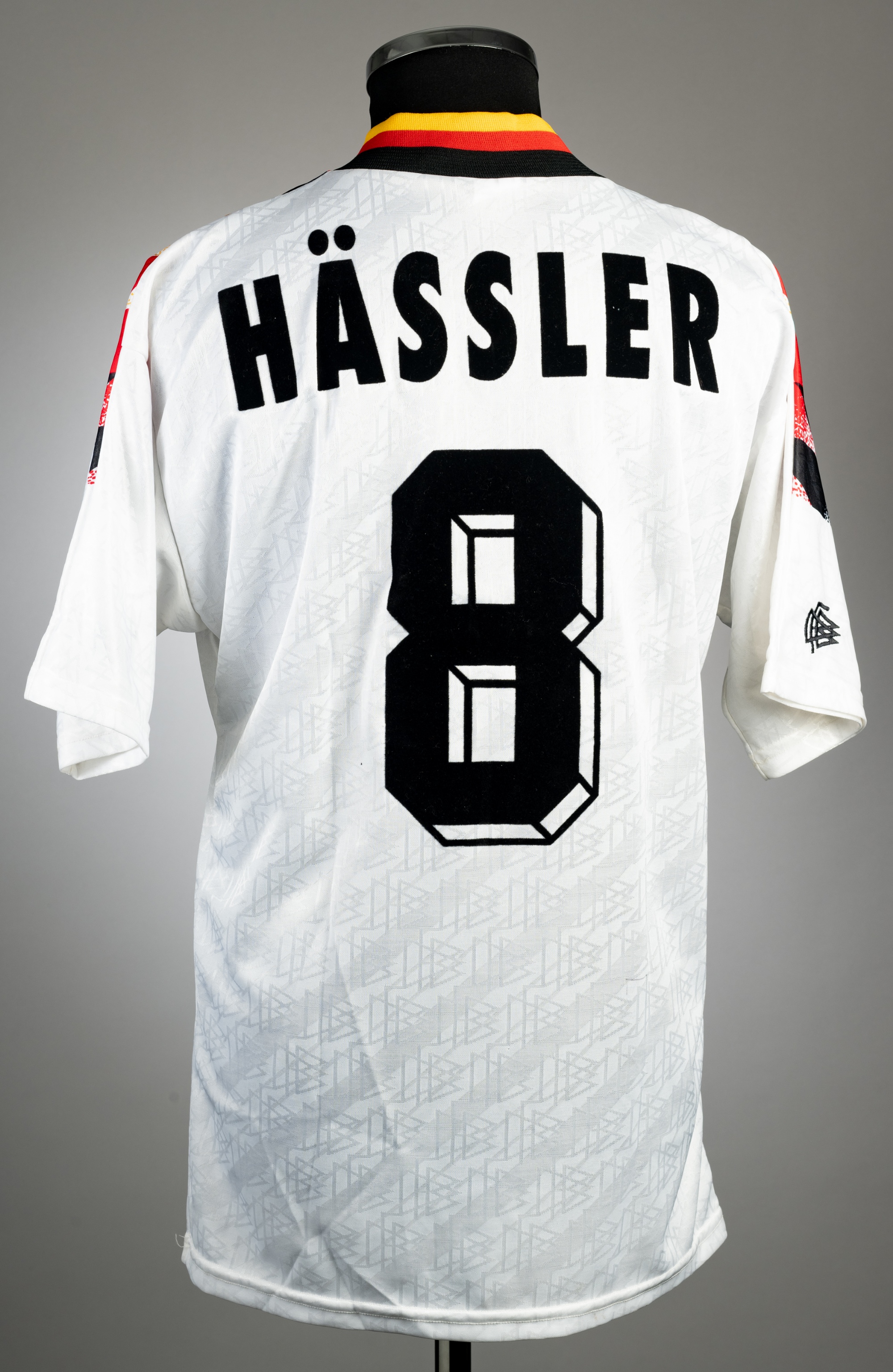 Thomas Hassler white Germany no.8 home jersey, circa 1995, Adidas, short-sleeved with national emblem, DFB logo on sleeved, reverse lettered HASSLER, size M, condition good