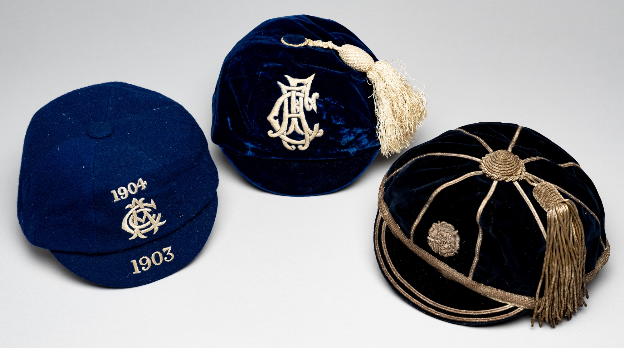 Three representative caps awarded to A Burn Murdoch, circa 1900s, comprising navy velvet cap with cream tassel and initials AFC, bearing internal retail label for J.C. STEWART EDINBURGH, hand written in black ink, undated; navy wool cap with cream initials ACC and 1903 -1904, bearing internal retail label for J.C. STEWART EDINBURGH, hand written in black ink; and navy velvet cap with gilt braiding and tassel and Tudor rose emblem, bearing internal retail label for ARTHUR SHEPPERD CAMBRIDGE OXFORD, hand written in back ink, undated, wear to braiding and internal silk lining, (3)