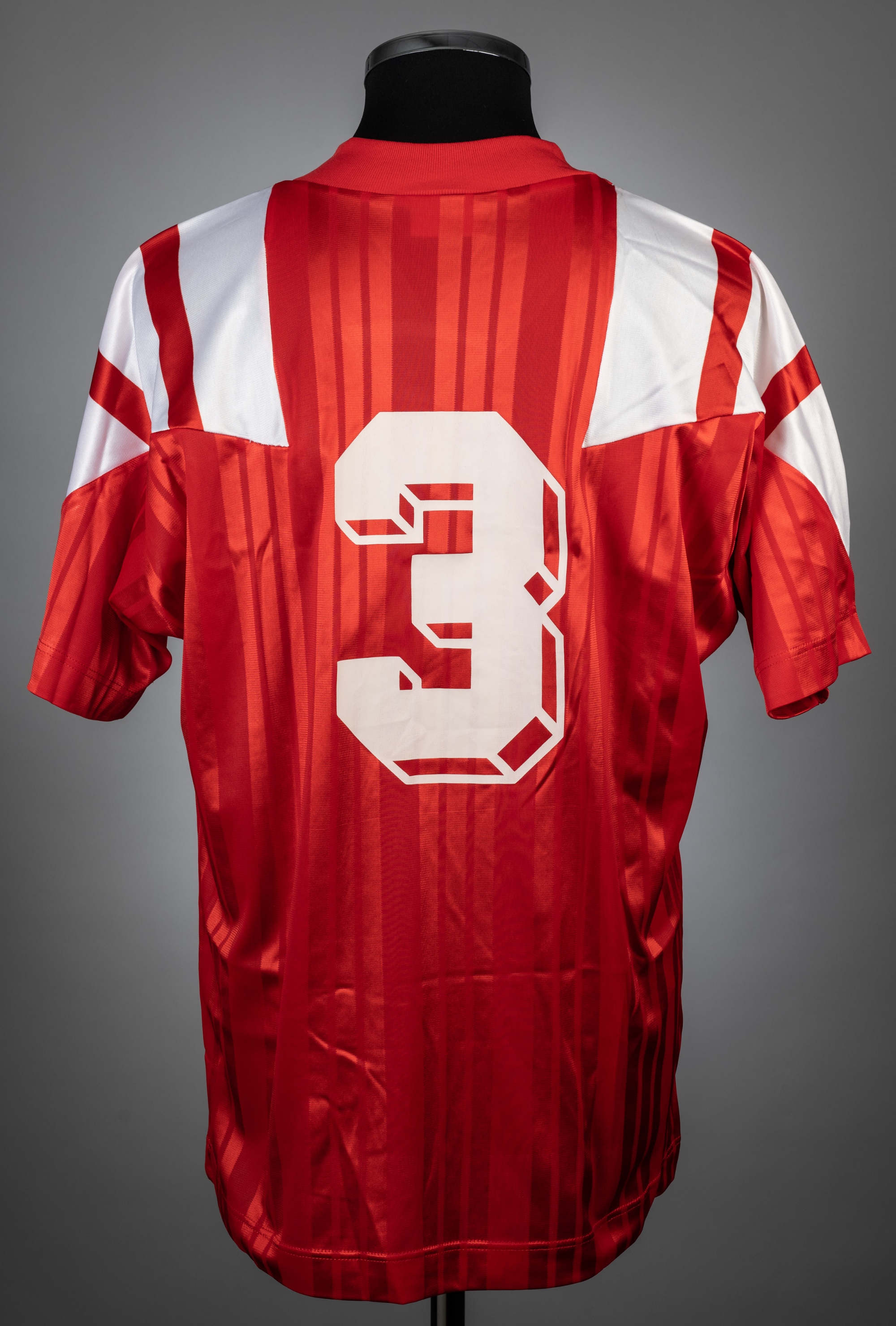 Red & white Oman no.3 international jersey, circa 1996, match-issue, Adidas, short-sleeved with national emblem badge, front and reverse numbered 3,