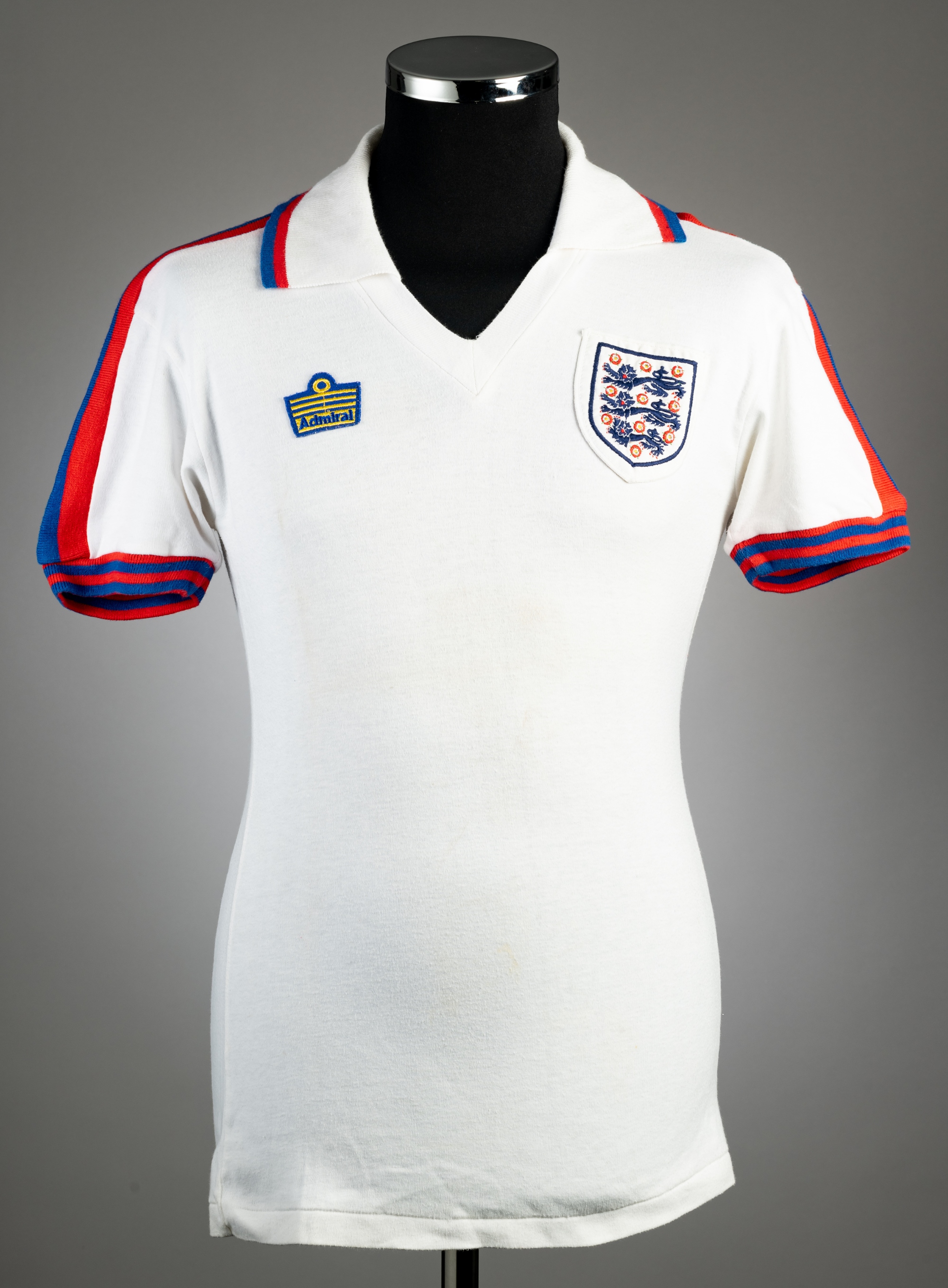 Steve Coppell white England no.16 home jersey v Wales, played at Wembley Stadium 23rd May 1979, Admiral, short-sleeved with red and blue trimmed collar and sleeve cuffs, England three lion badge, blue and yellow Admiral badge, reverse numbered 16 in red, size Mens 40in., bears stain to front This fixture resulted in a 0-0 draw with Steve Coppell substituted on during the match.