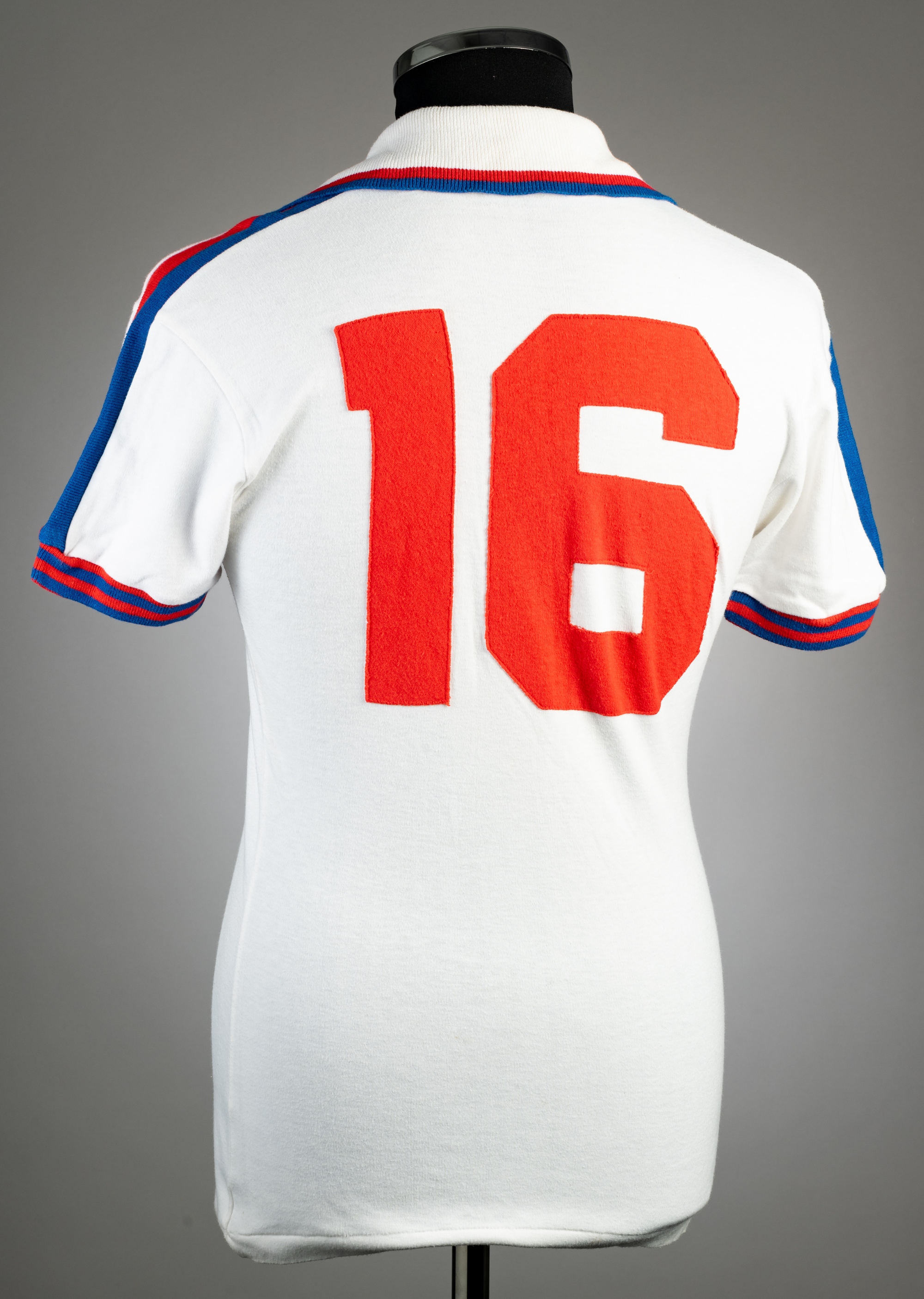 Steve Coppell white England no.16 home jersey v Wales, played at Wembley Stadium 23rd May 1979, Admiral, short-sleeved with red and blue trimmed coll