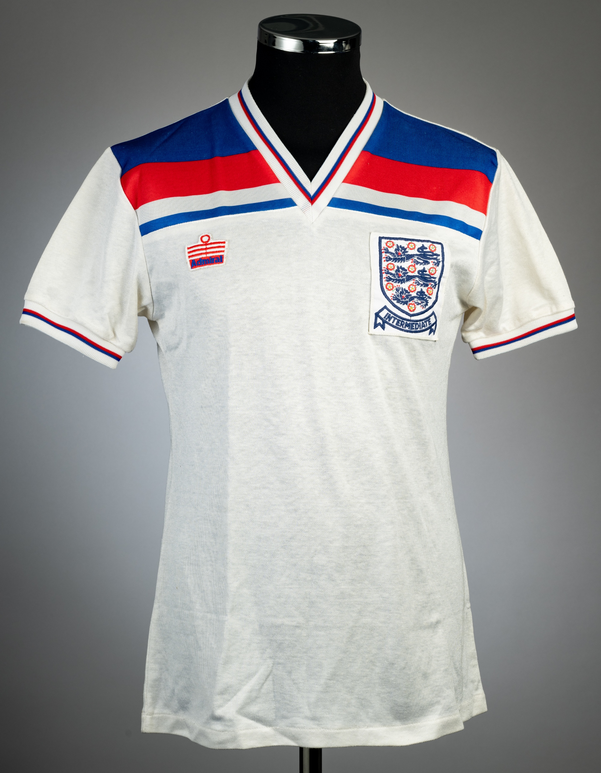 White England Intermediate no.8 home jersey, circa early 1980s, Admiral, short-sleeved with three lion Intermediate badge and red Admiral badge, reverse numbered 8 bearing Admiral white logo, size 38 to 40in., slight yellowing to white jersey