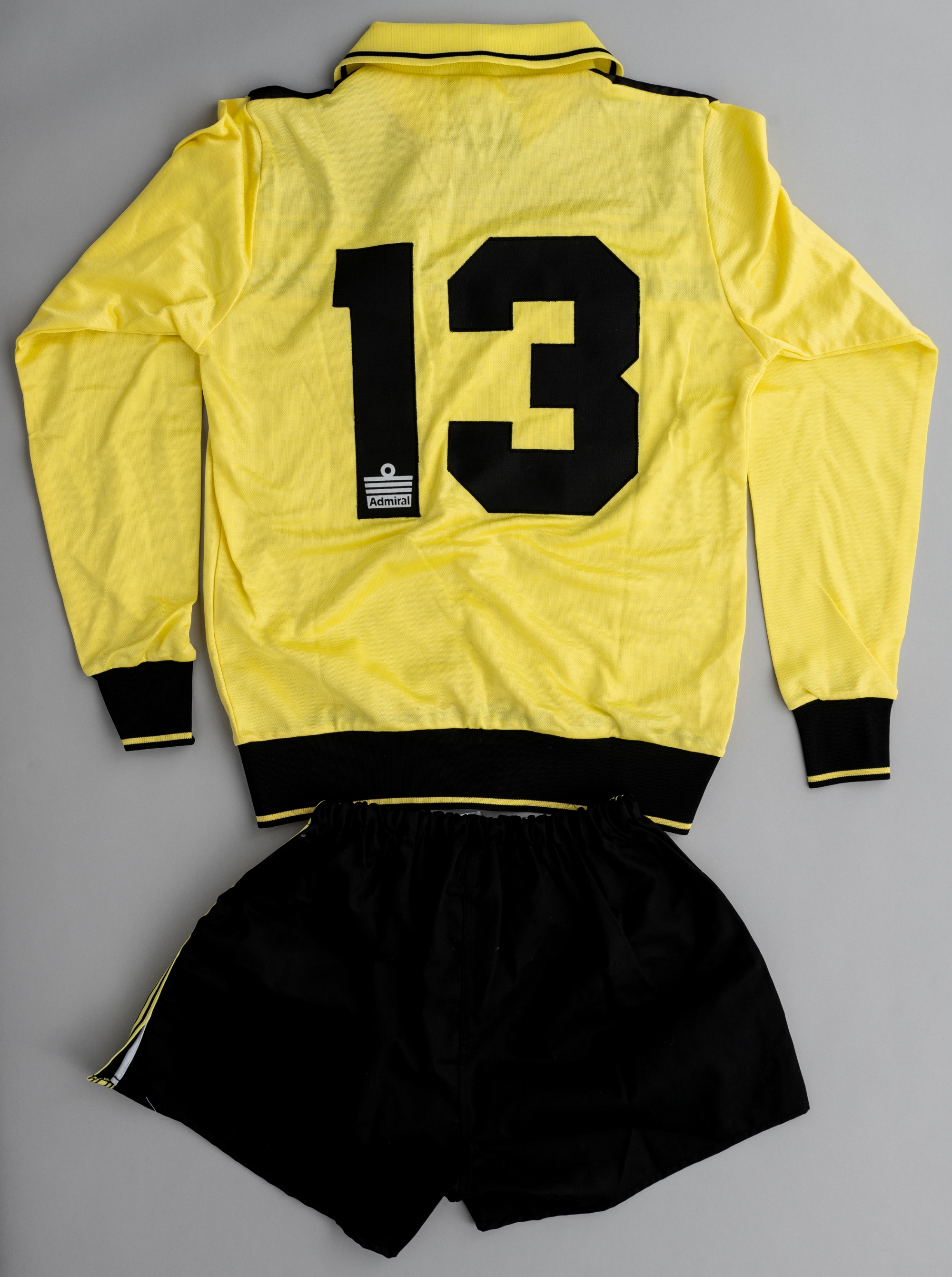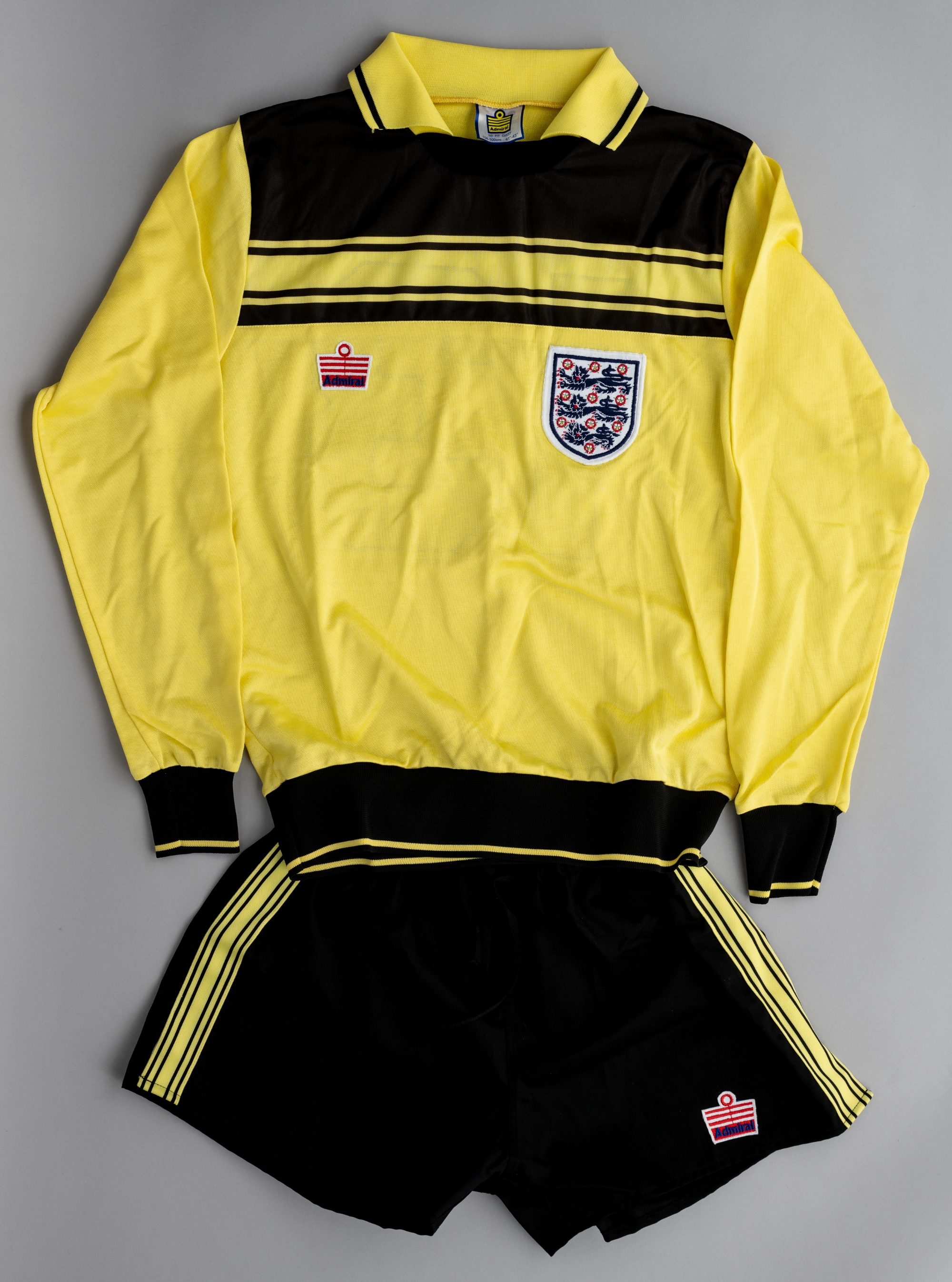 Yellow England no.13 goalkeeping jersey and shorts, circa 1982, Admiral, long-sleeved with England three lion badge, red Admiral badge, reverse numbered 13 with Admiral logo to the number one, size 41-43in., good condition; black shorts with yellow trim, bearing red Admiral badge, size 36-38in., good condition, (2)