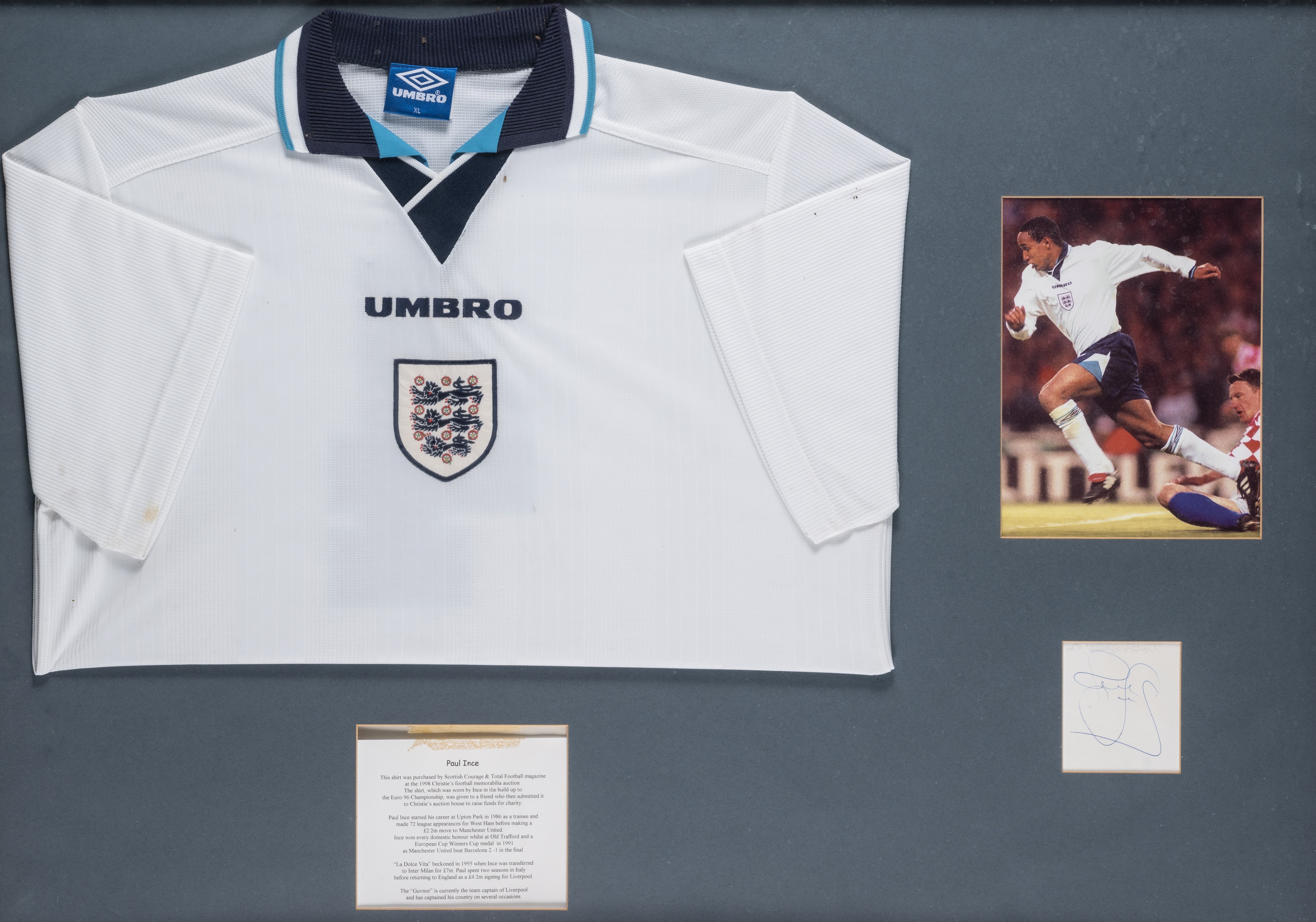 Paul Ince white England jersey worn in the build up to the 1996 Euro's, Umbro, short-sleeved with national three lion emblem, folded and mounted with a 9.5 by 7in. colour photograph of Paul Ince in action for England wearing a similar long-sleeved jersey, above a signed autograph page in blue ink, with legend, glazed and framed, overall 80 by 107cm. Provenance: Bought from Christies Football Memorabilia Auction, 1998. All glass will be removed from framed and glazed items prior to posting and may result in delays to shipping your items. (This service is included in the cost of postage and packing). We can also totally remove all framing and mounts upon request to reduce shipping costs. Alternatively lots can be collected in person by prior appointment from NN8 1RT.