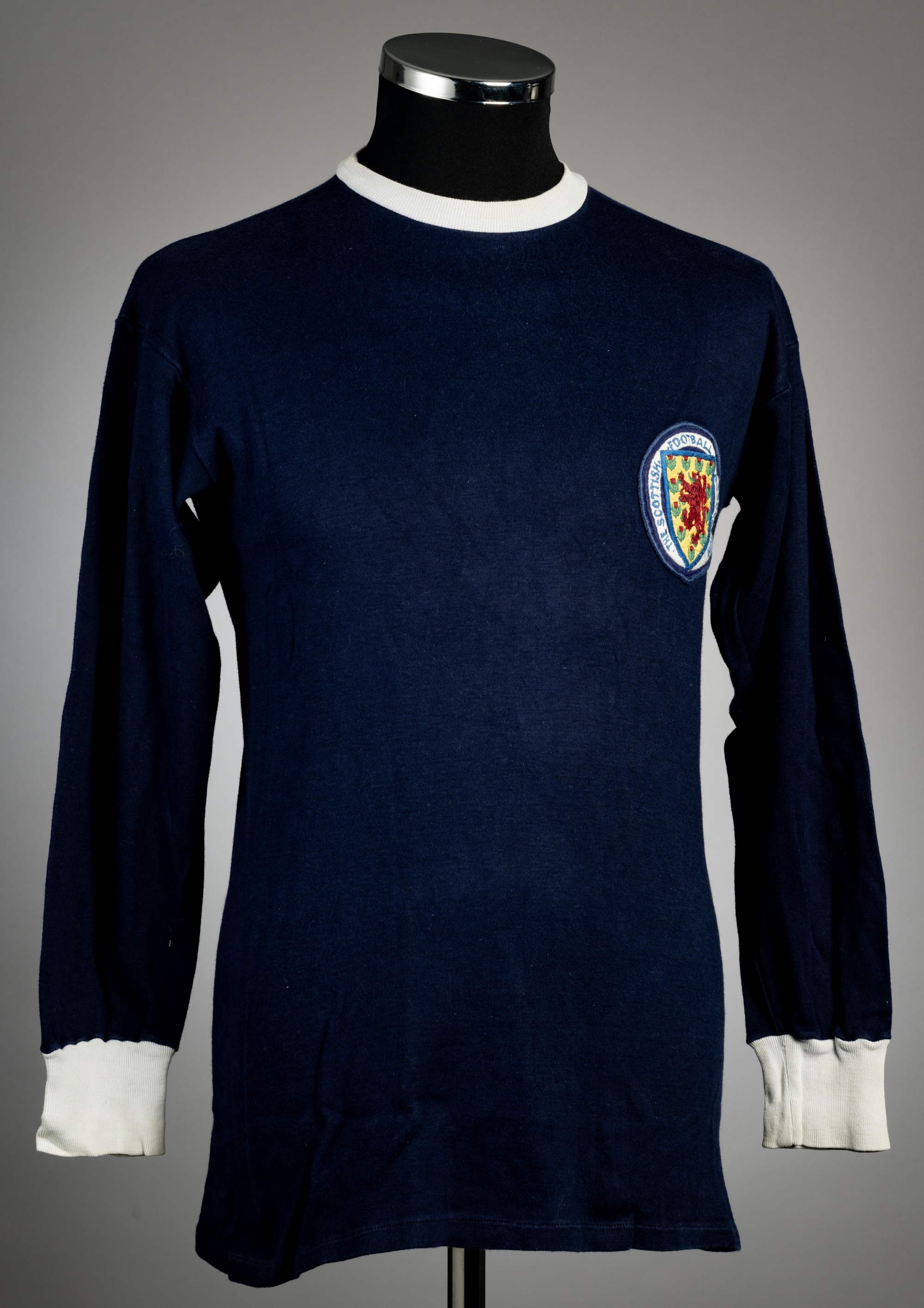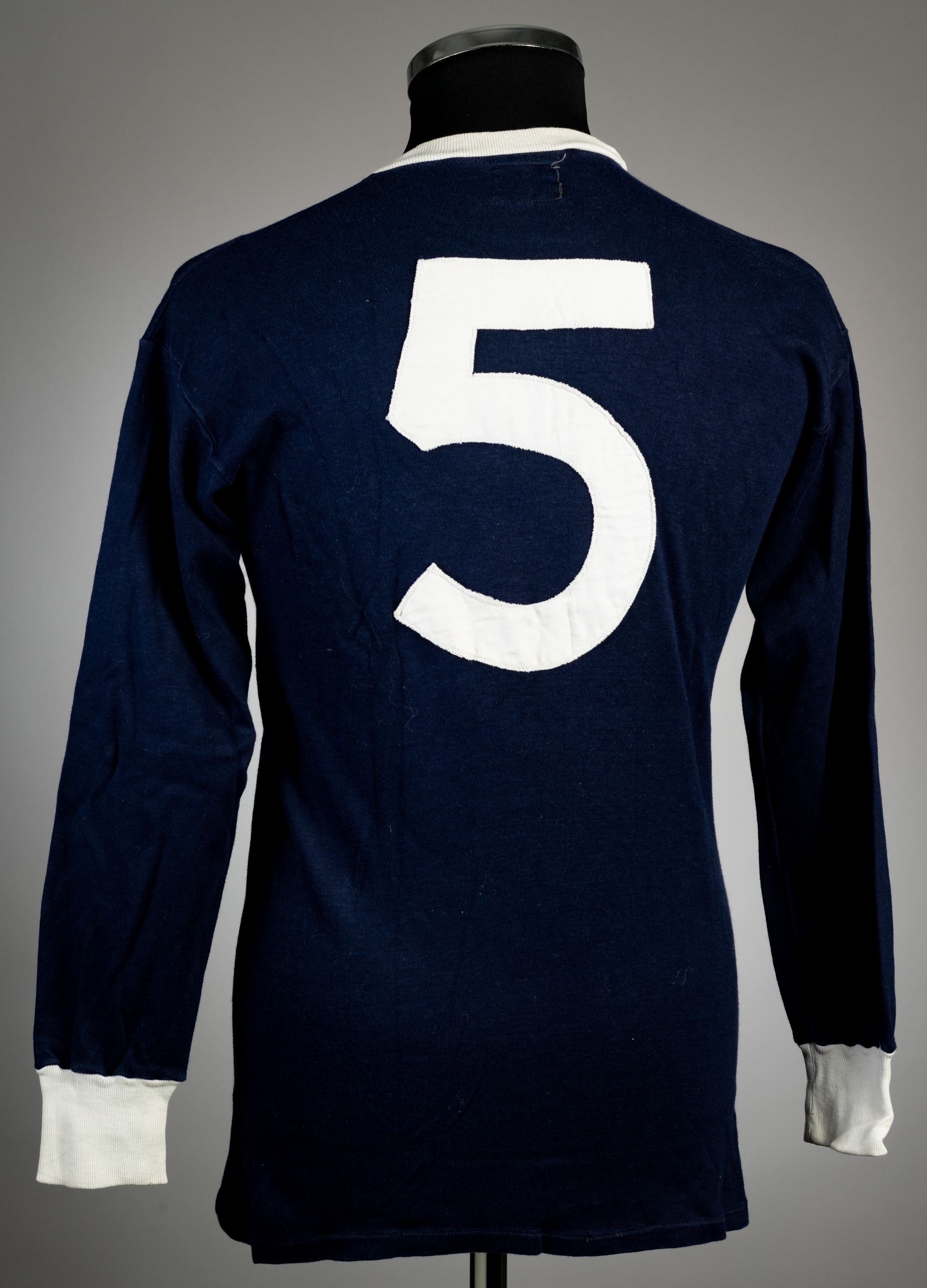 Blue Scotland no.5 home jersey, circa mid 1960s, T. Alexander & Sons, long-sleeved with white collar and cuffs, embroidered national emblem badge, re