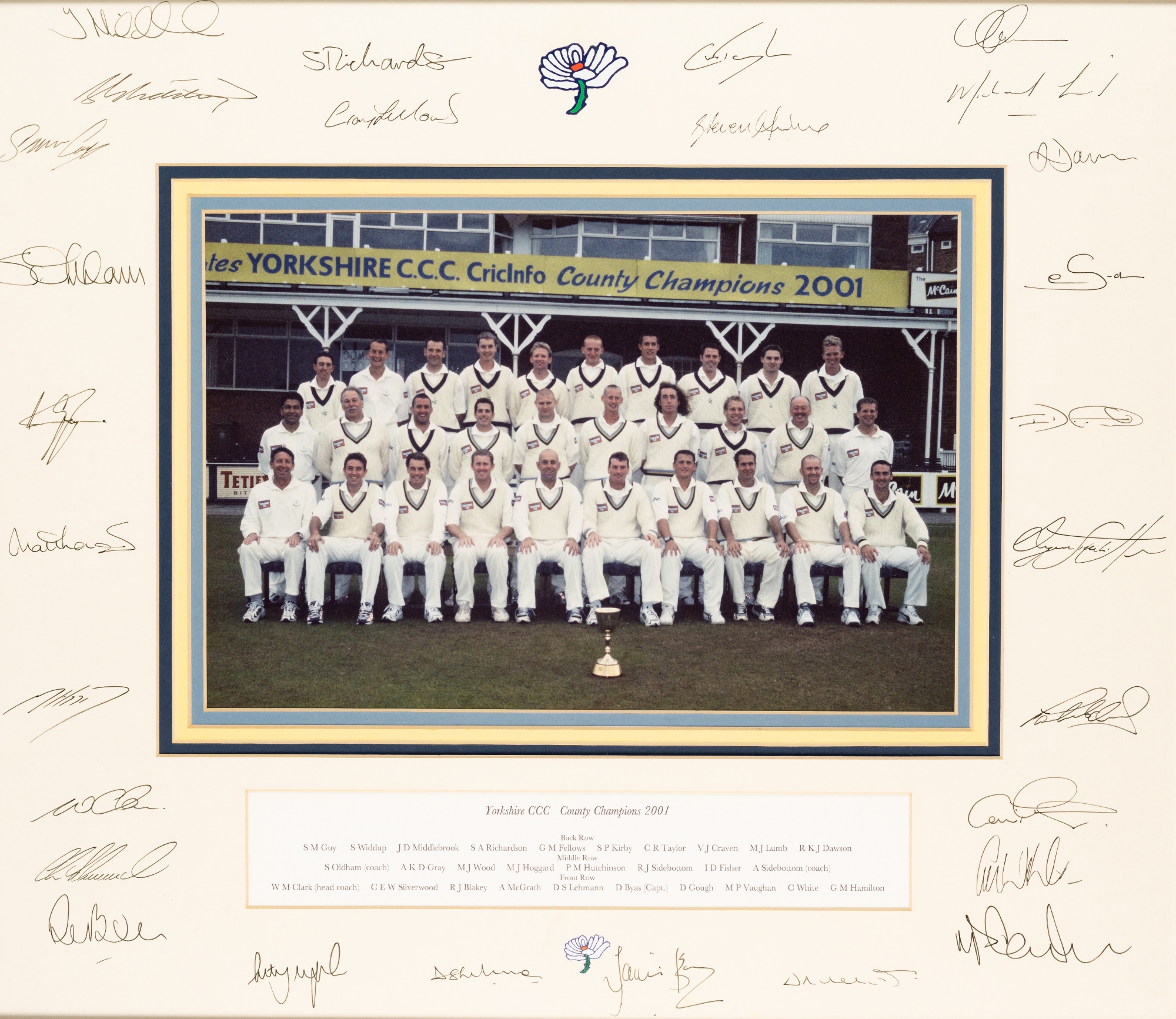 Autographed colour photograph of the Yorkshire CCC 2001 County Champions team. formal team-group with trophy cup, the mount bearing 28 signatures in black ink around the border, with typed legend, glazed and framed, overall 43 by 49cm.