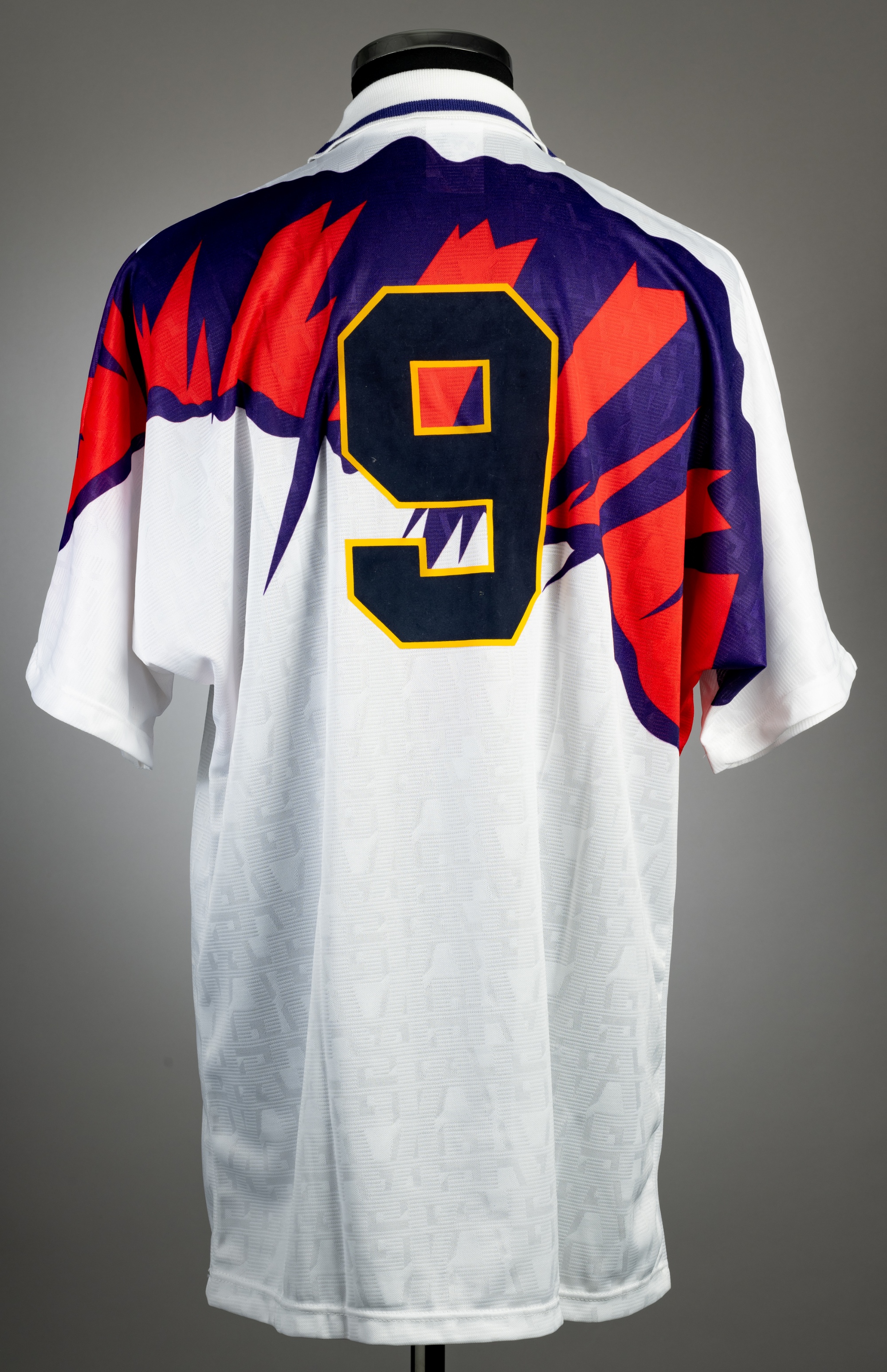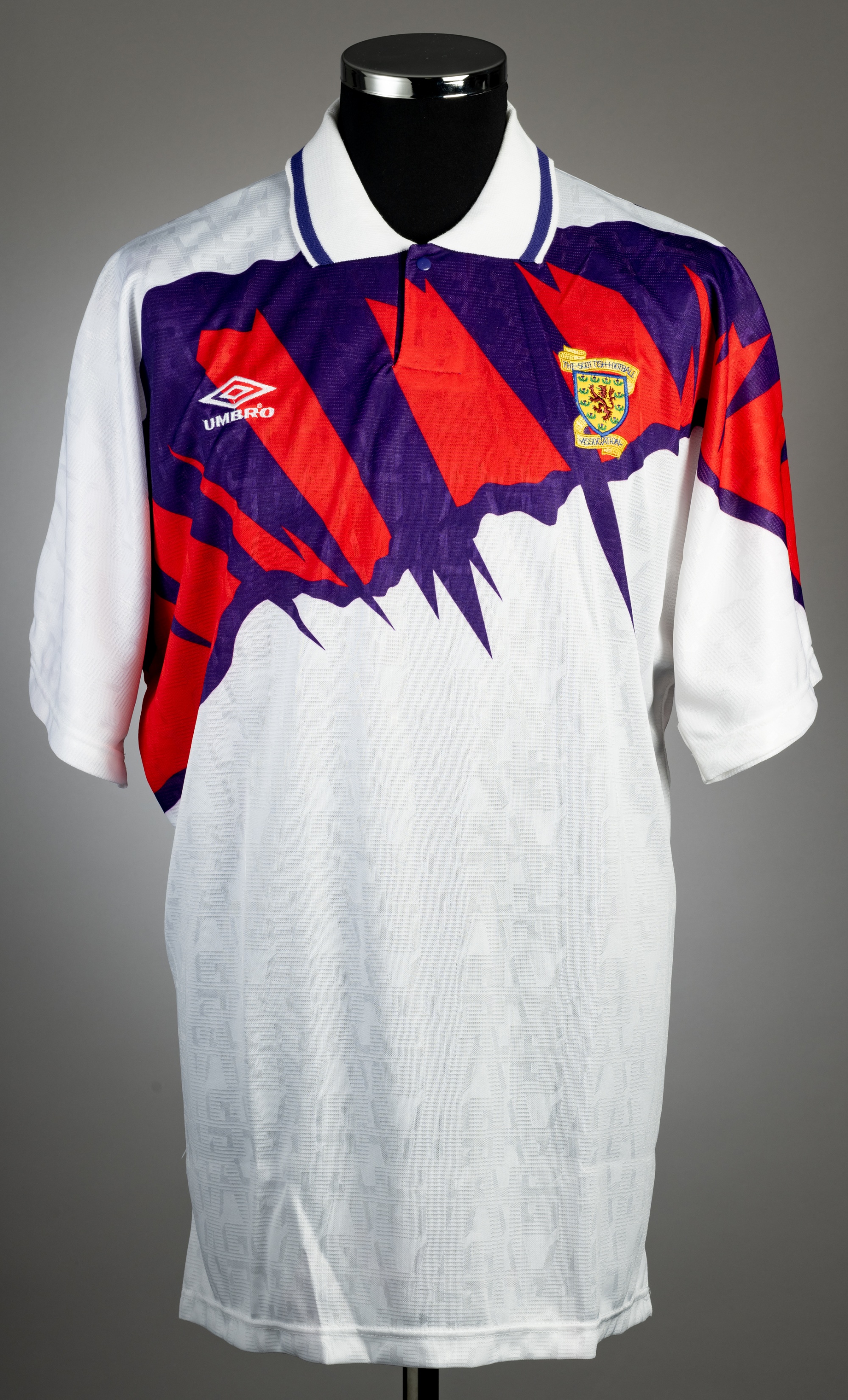 White, red and purple Scotland no.9 away jersey, circa 1992, Umbro, short-sleeved with Scottish national emblem, Umbro logo, reverse numbered 9, size