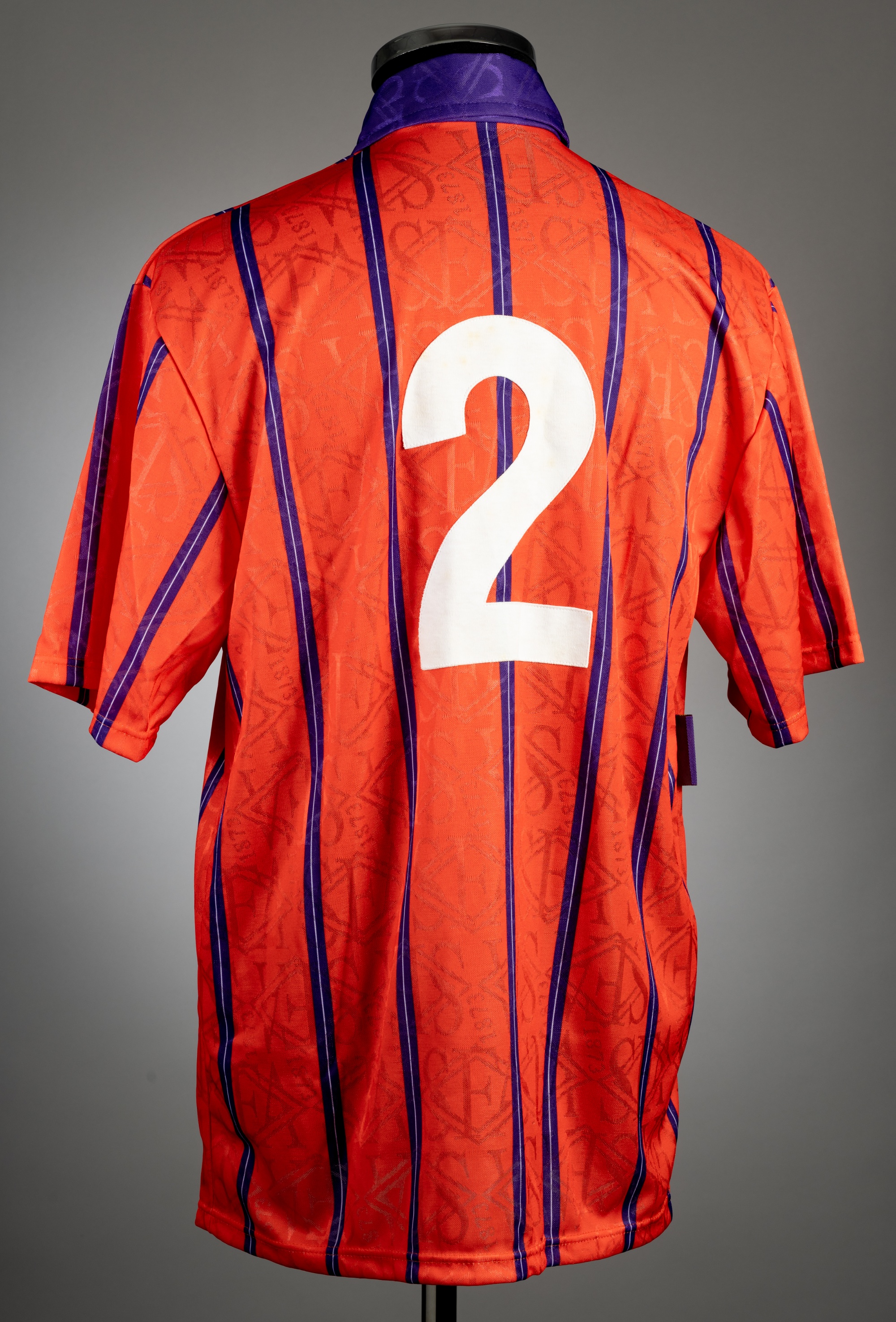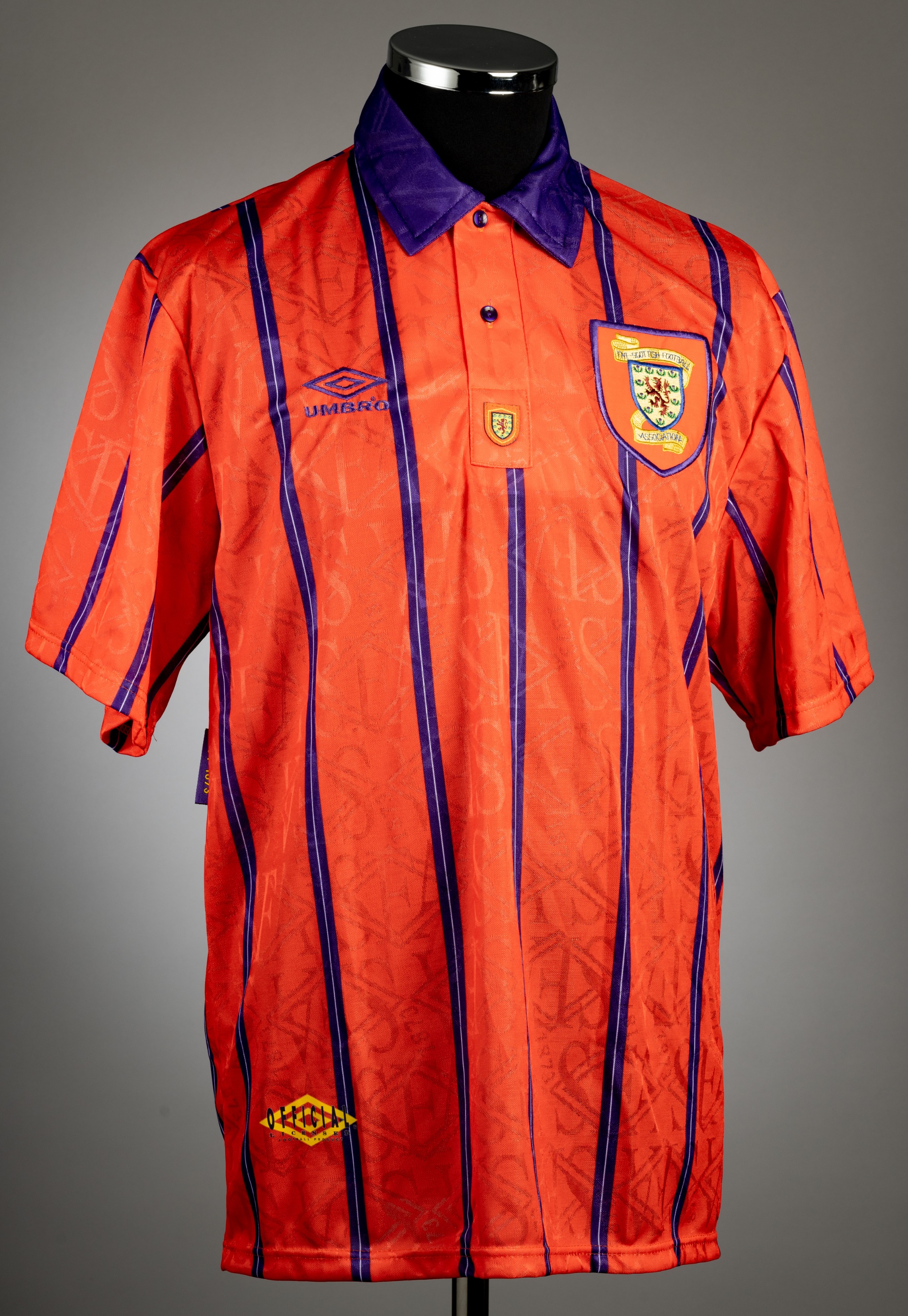 Orange and purple Scotland no. 2 away jersey, circa 1993, Umbro, short-sleeved with Scottish national emblem and Umbro logo, reverse numbered 2, size L, overall good condition with slight stains to white number two on reverse