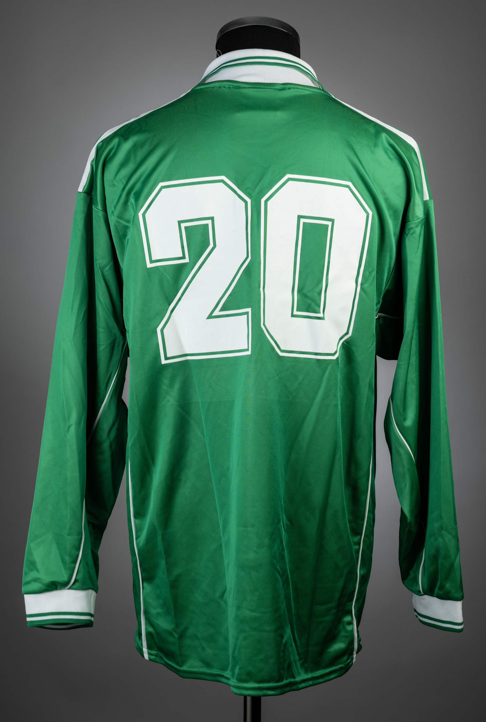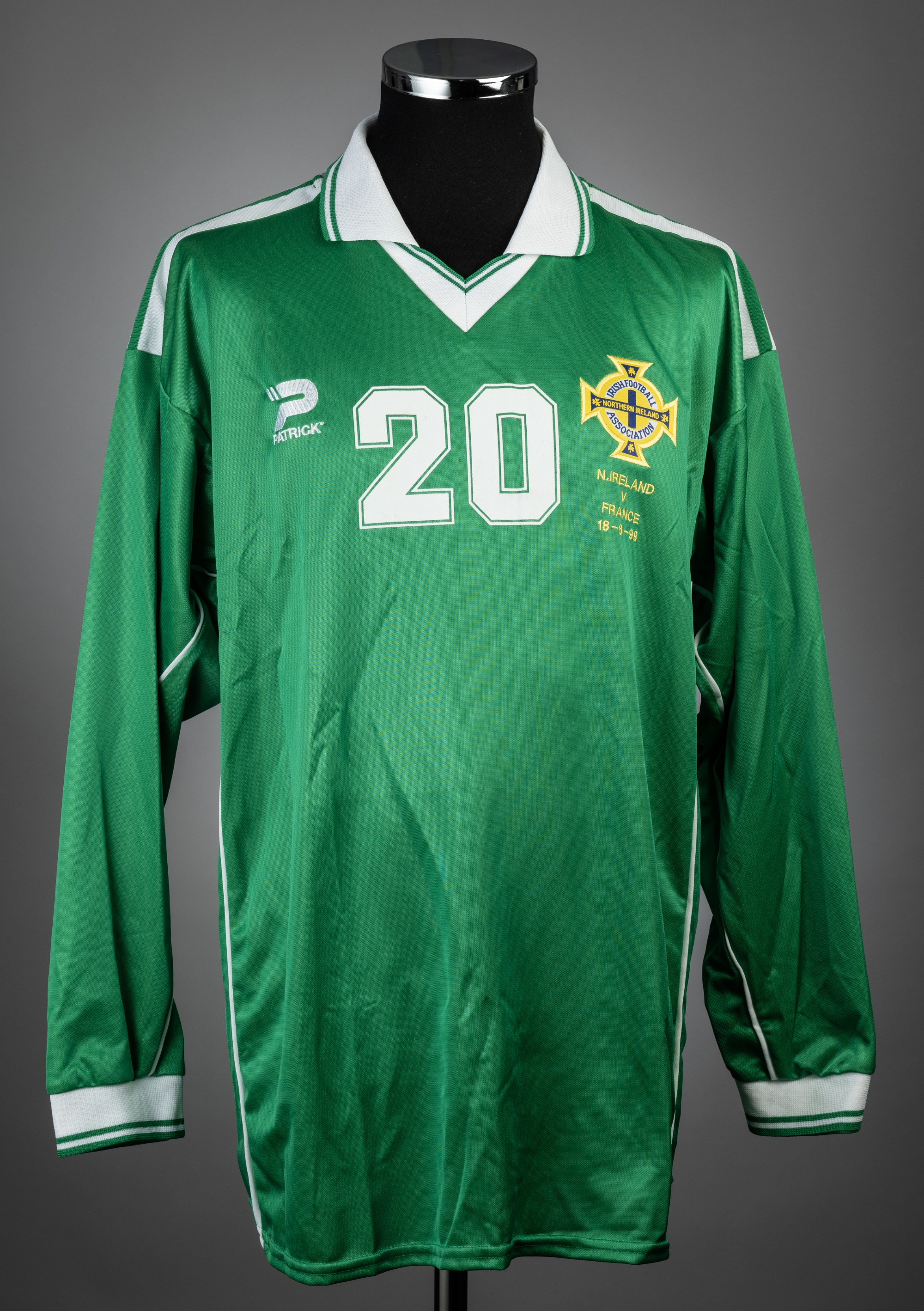 Green & white Northern Ireland no.20 jersey v France, played at Windsor Park, 18th August 1999, match-issue, Patrick, long-sleeved with national emblem, embroidered N. IRELAND V FRANCE 18-8-99, numbered front and reverse, size XL France defeated Northern Ireland 1-0.