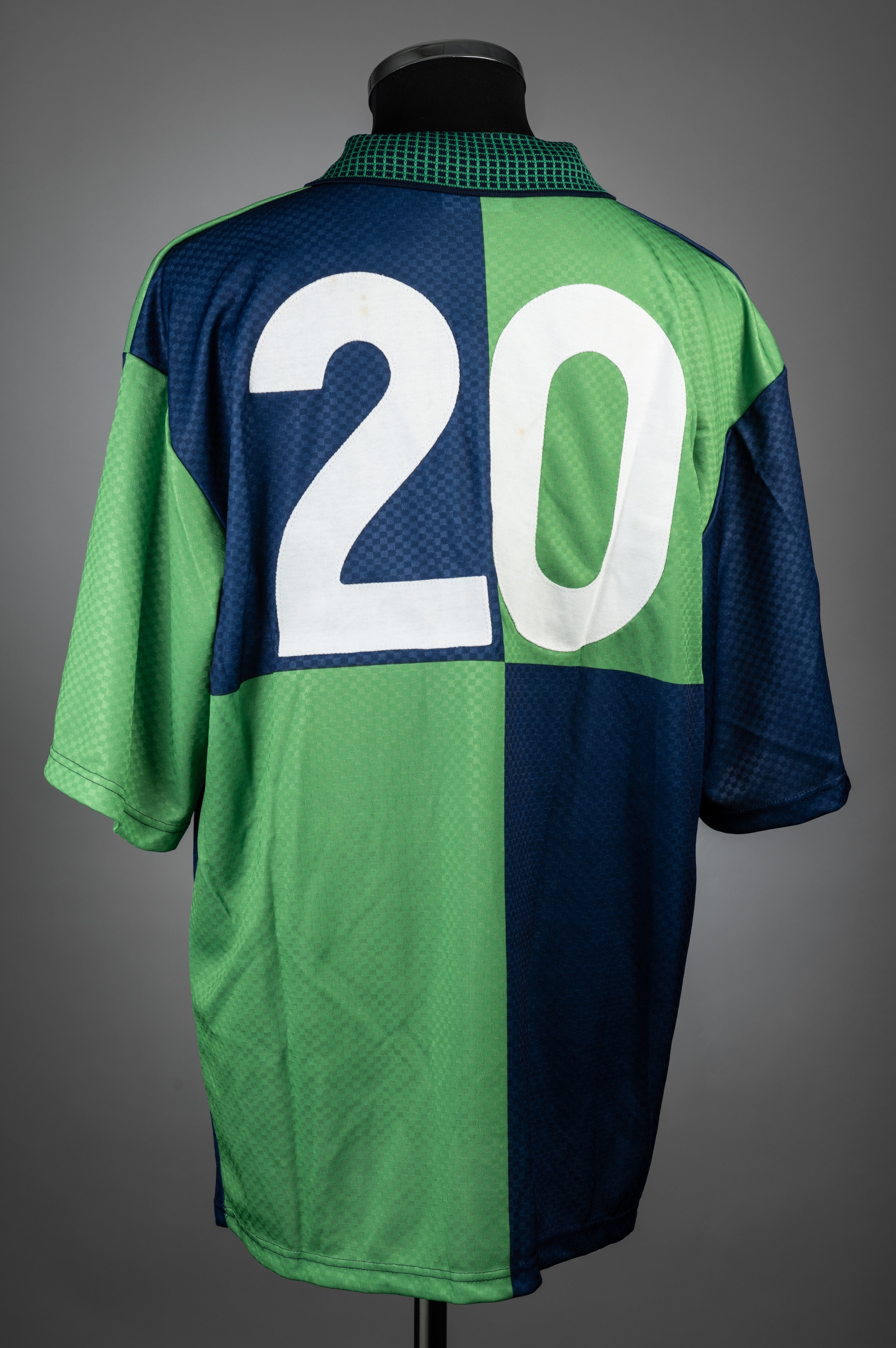 Green & navy Northern Ireland FIFA World Cup Qualifier no.20 away jersey v Ukraine, played at Kiev, 2nd April 1997, match-issue, Asics, short-sleeved with national emblem and embroidered UKRAINE V N. IRELAND 2 APRIL 1997, numbered front and reverse, size XL Ukraine defeated Northern Ireland 2-1.
