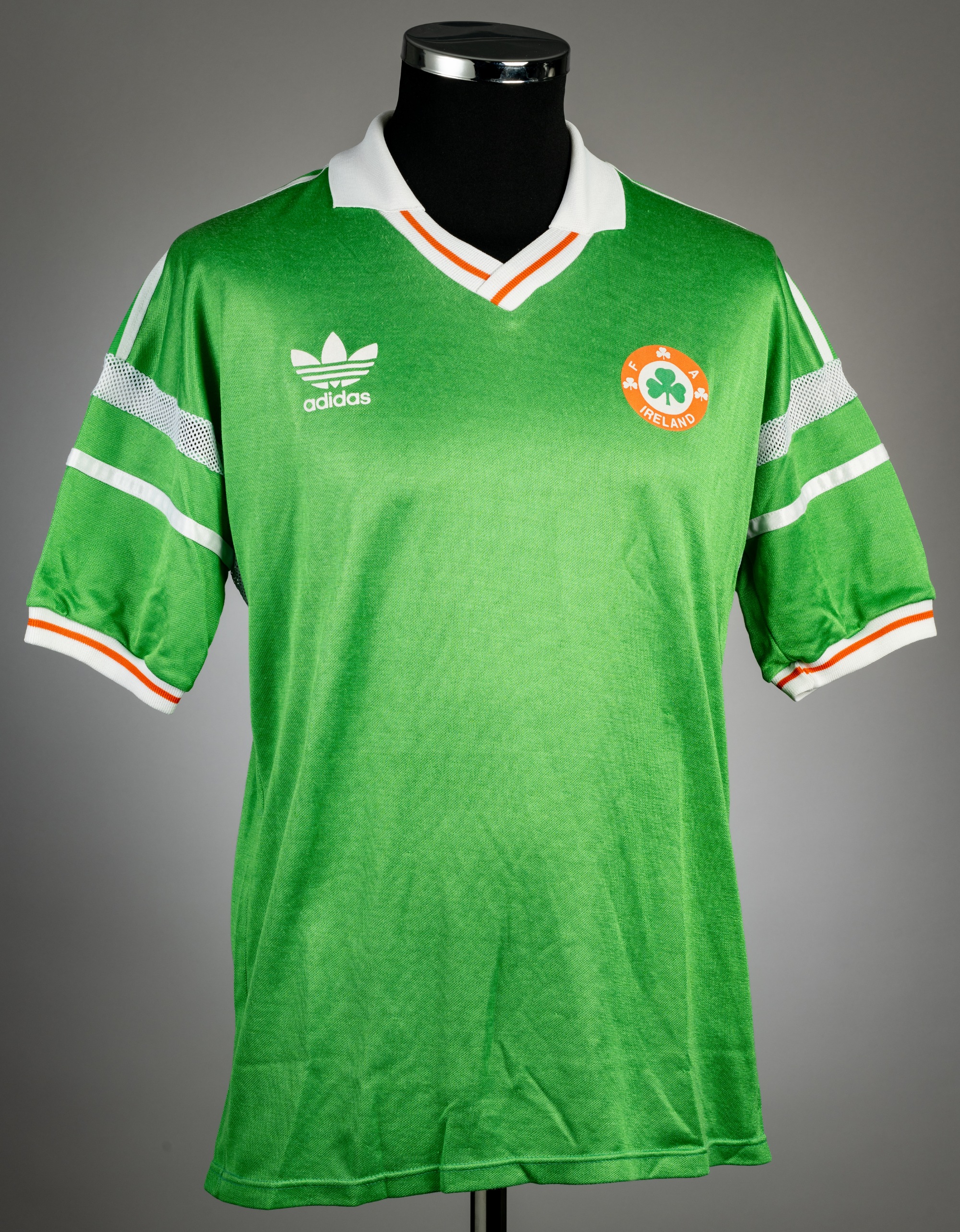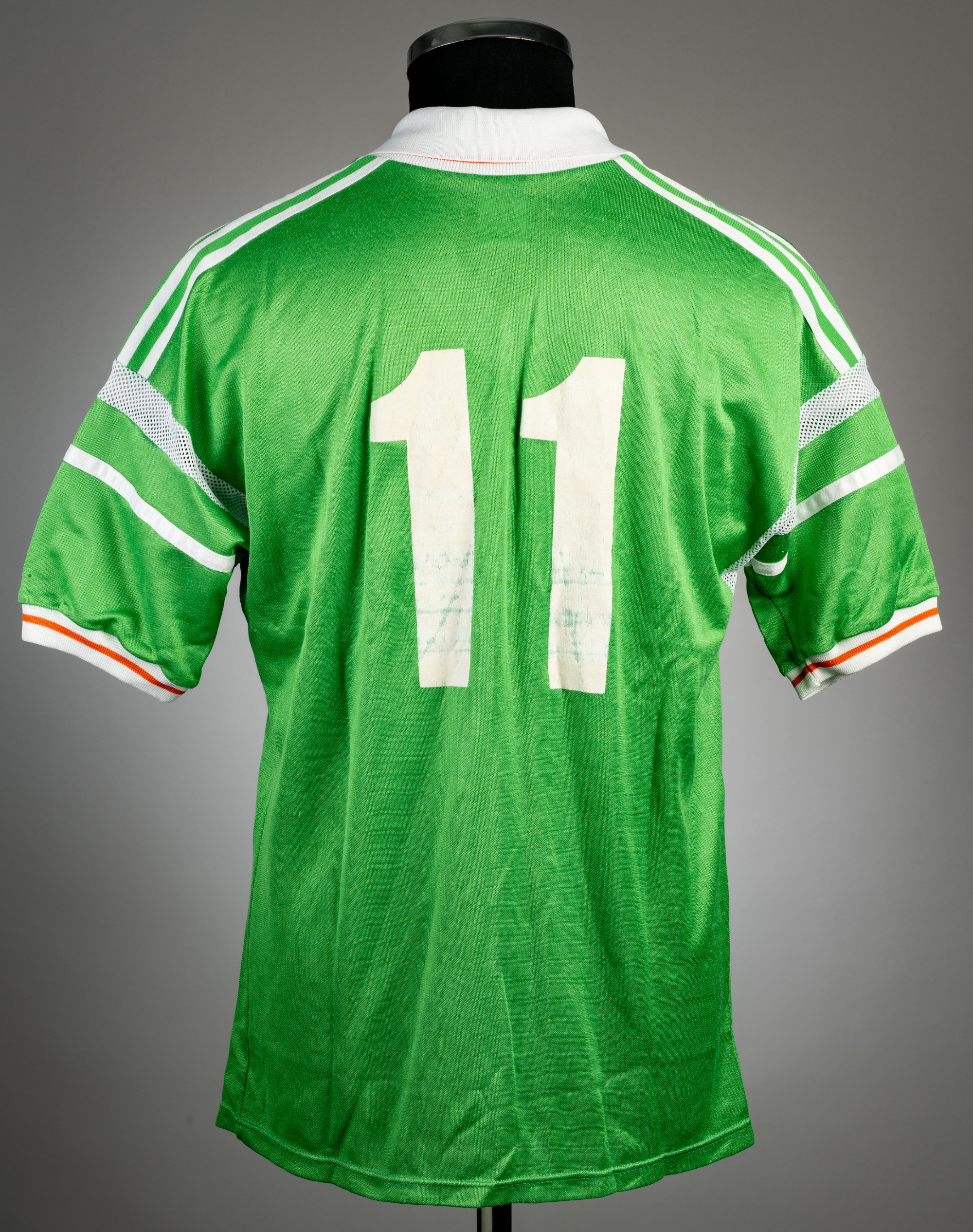 Green Republic of Ireland no.11 home jersey, circa 1988, Adidas, short-sleeved with FA Ireland badges and Adidas logo, reverse numbered 11, bears wea