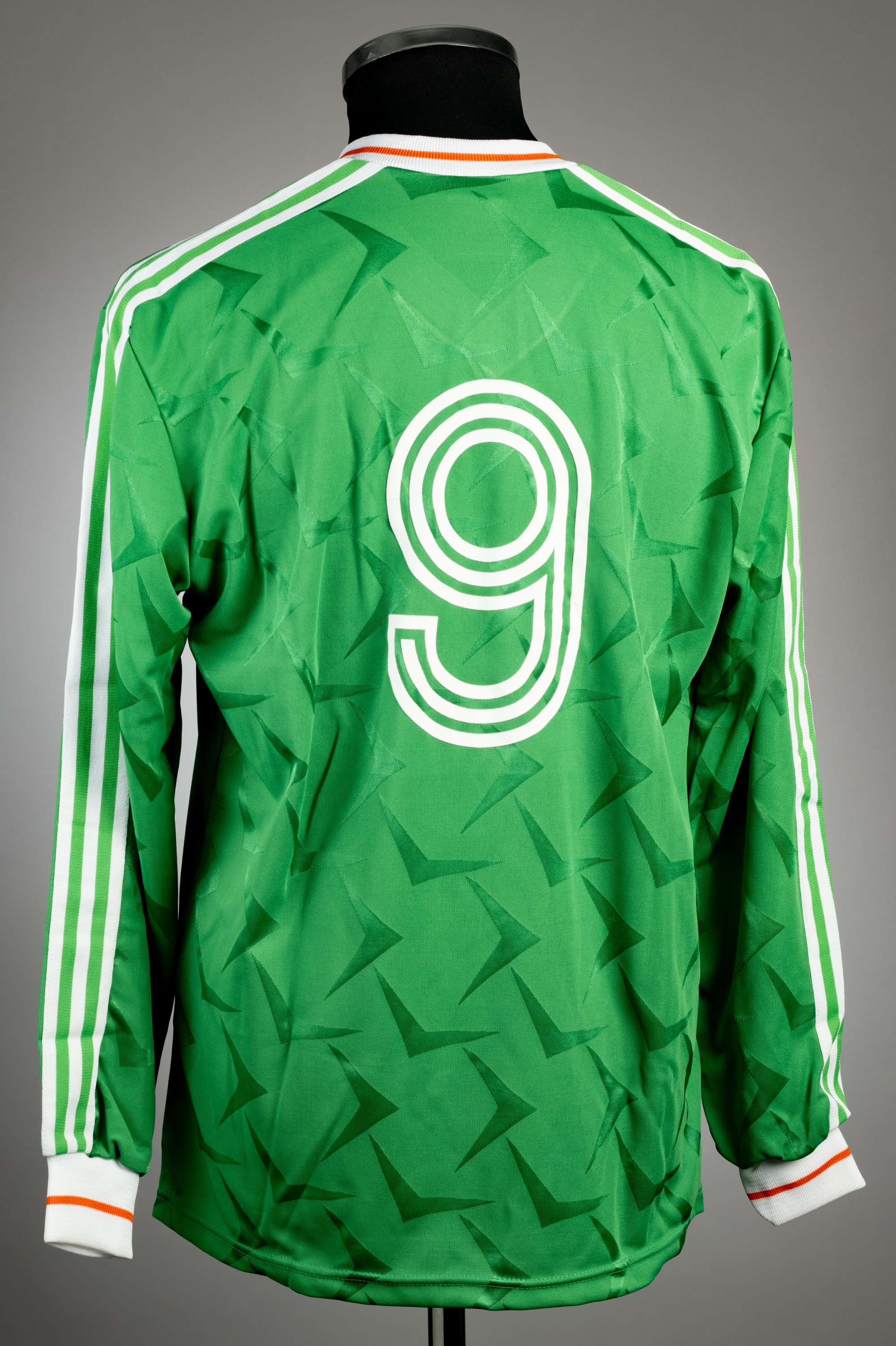 Green Republic of Ireland no.9 jersey, circa 1991, Adidas, long-sleeved with FA Ireland badges and Adidas logo, reverse numbered 9, size L