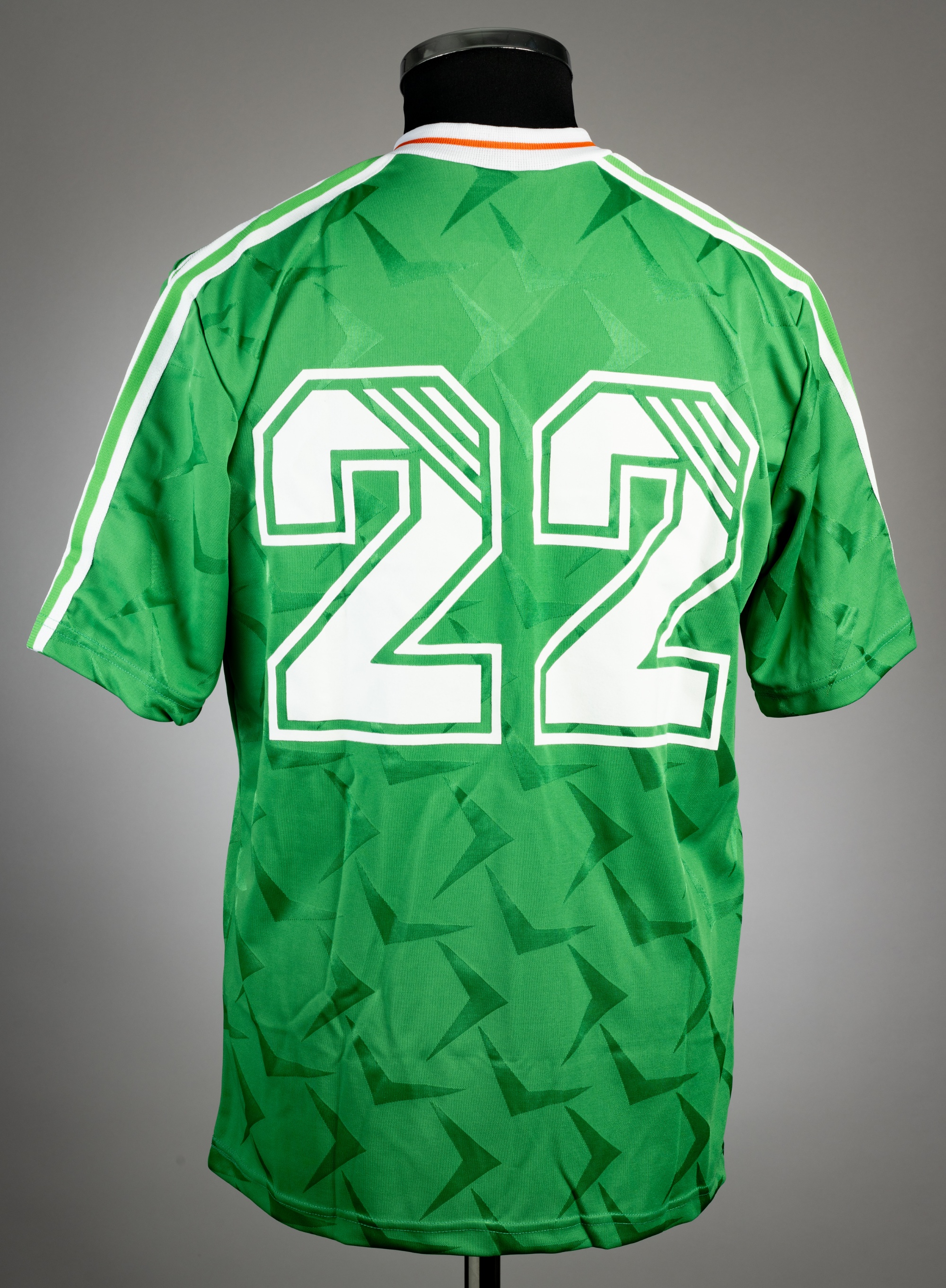 Green Republic of Ireland no.22 jersey from the 1992 US Cup, Adidas, short-sleeved with FA Ireland badges and Adidas logo, numbered 22 on front and reverse, size L