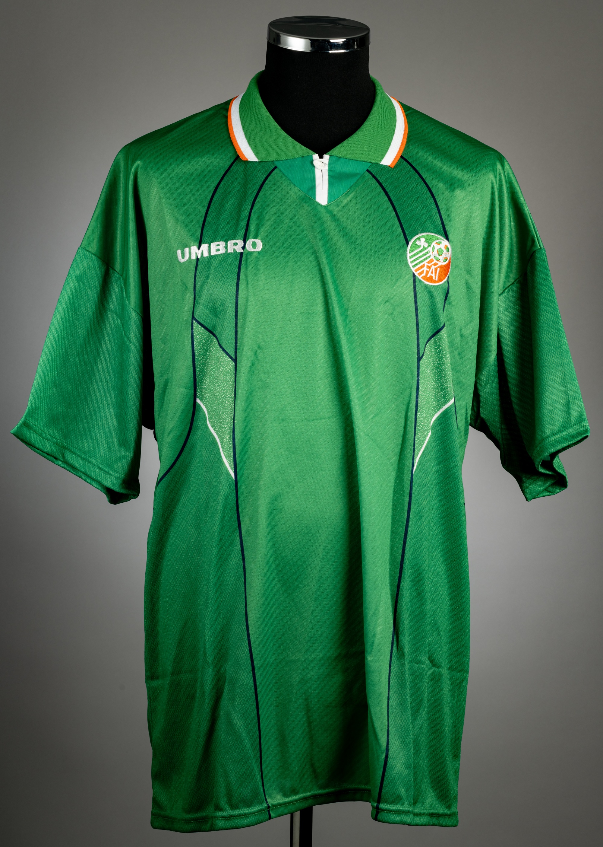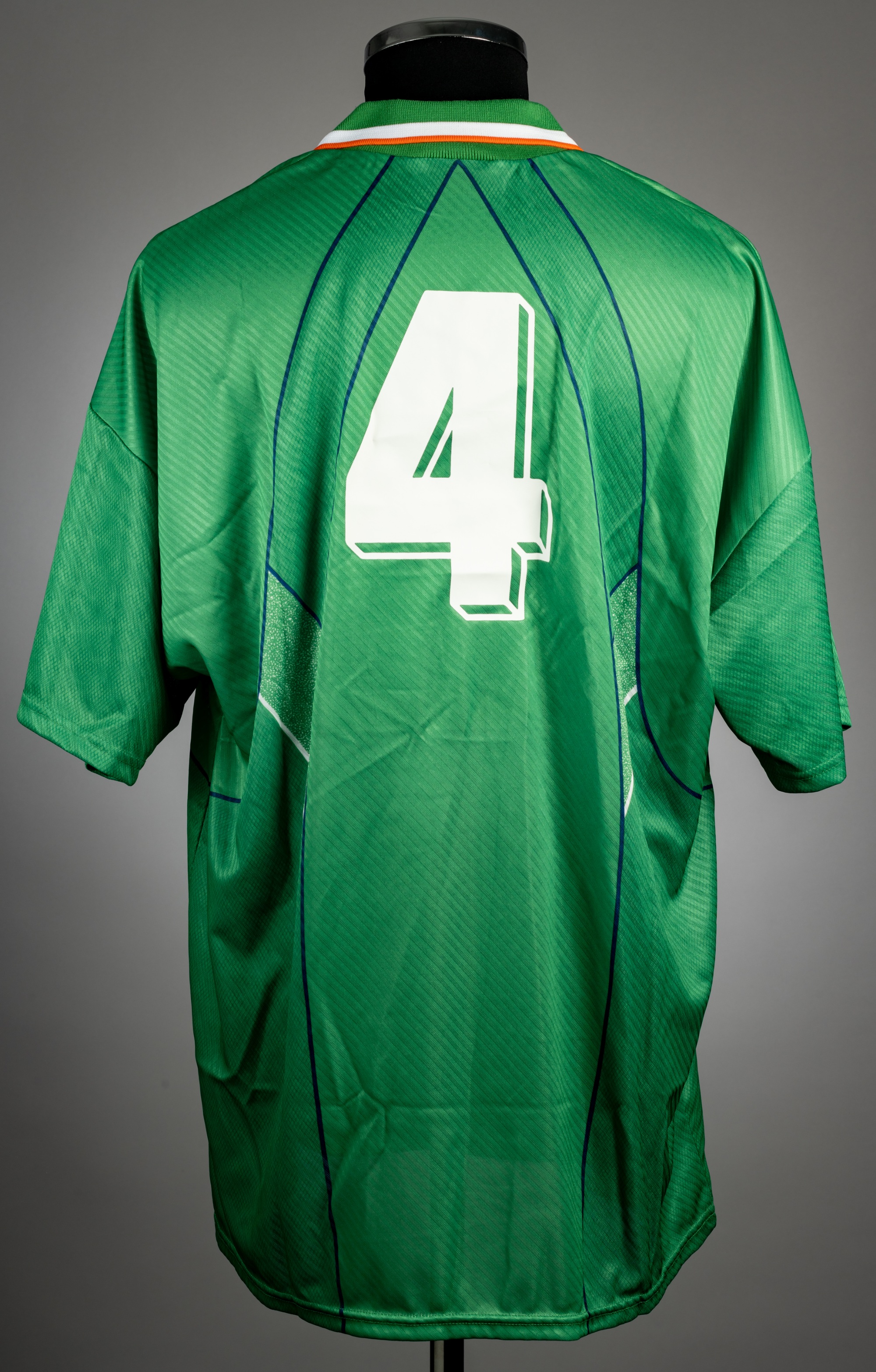 Green Republic of Ireland no.4 home jersey, circa 1995, Umbro, short-sleeved with FA Ireland badges and Umbro logo, reverse numbered 4, size XL