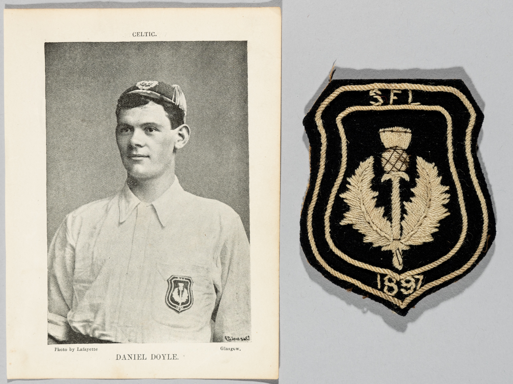 Scottish Football League representative match shirt badge awarded to Celtic's Daniel Doyle in 1897, black cloth shield shaped badge with cream threadwork featuring Scottish thistle emblem, SFL and 1897, 9 by 8cm., sold with a printed photograph of Doyle, extracted from a book, (2)