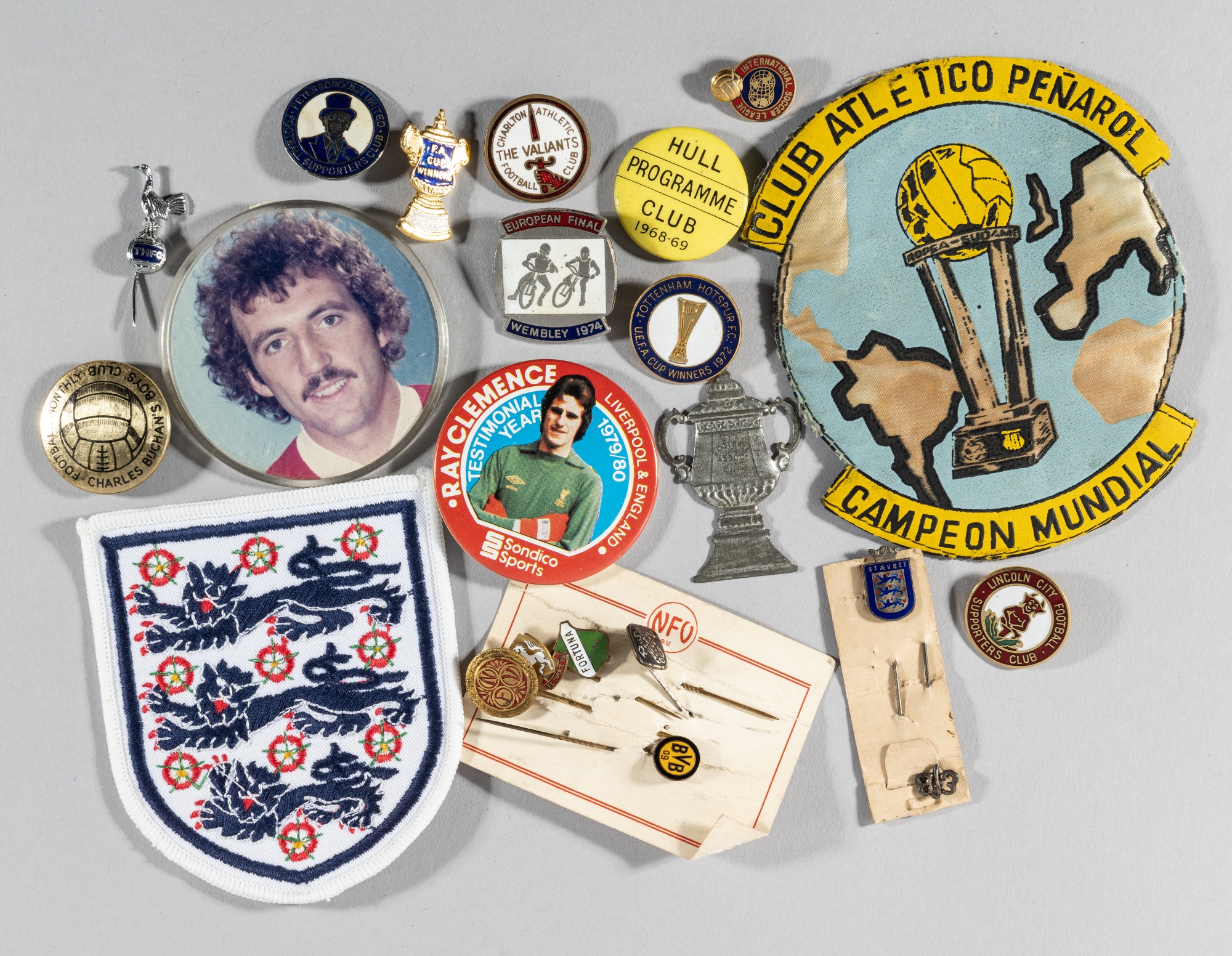 A collection of football badges, mostly metal & enamel, also cloth including and England three lions, pin buttons, good selection of supporters' club