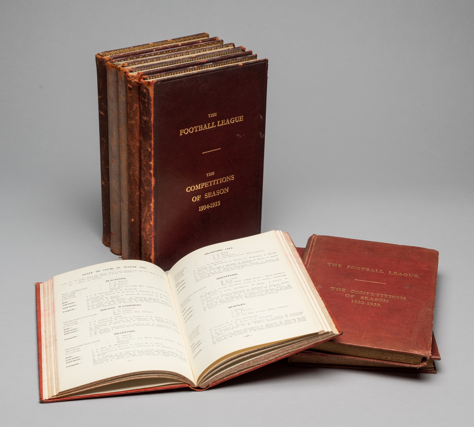 A rare full set of eight "The Football League, The Competitions of Seasons 1931-32 to 1938-39" compiled by W M Johnston, 1931-32 being a signed presentation copy from the compiler to J J Edwards,1932-33 from a limited edition of 25 presentation copies named to F Pitchers, 1933-34 from 35 presentation copies, 1934-35 to 1936-37 from 40 presentation copies, the 36-37 being Johnston's personal copy stamped W.M.J. in gilt to front cloth, 1937-38 and 1938-39 from 50 presentation copies. all in red leather boards, condition of bindings varying from good to fair, 1931-32 the poorest with staining to covers, also some with spine colour fading, internally the set is good W M Johnston was the editor of the Arsenal match programme and later became a club director.