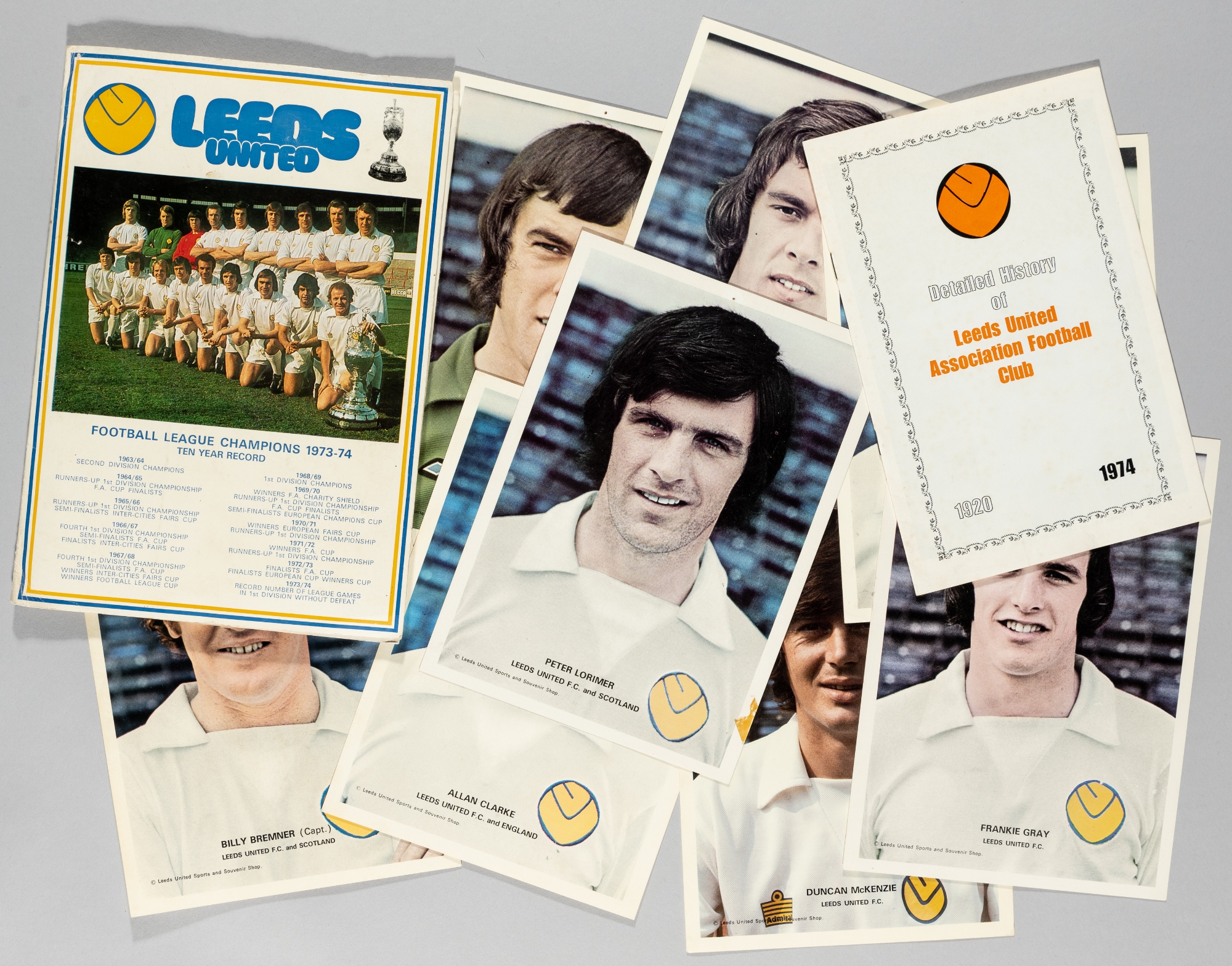 Leeds United Football League Champions player profile cards 1973-74, contained in a sleeve with team image on the front and facsimile player signature on the interior fold, contains 14 player profile cards and further duplications, also included a detailed history of Leeds United Association FC, bears wear with sellotape marks