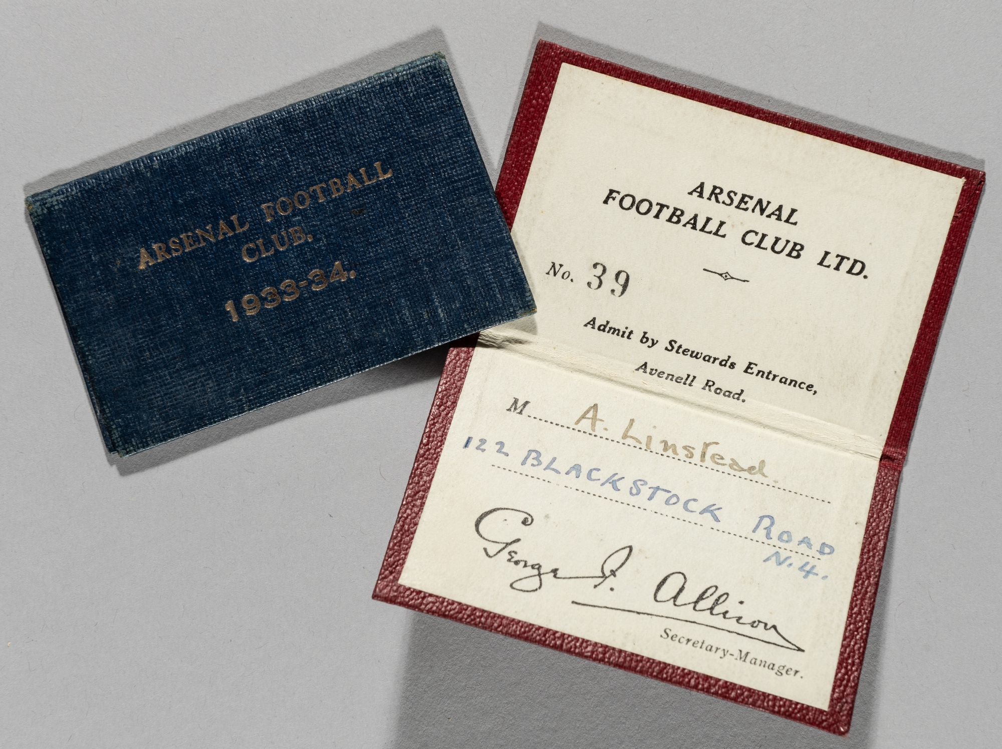 Two Arsenal Football Club Steward's admittance cards for season 1933-34 and 1937-38, both issued to A Linstead of 122 Blackstock Road, N4, the first in blue cloth boards, the other in red, both stamped gilt, good