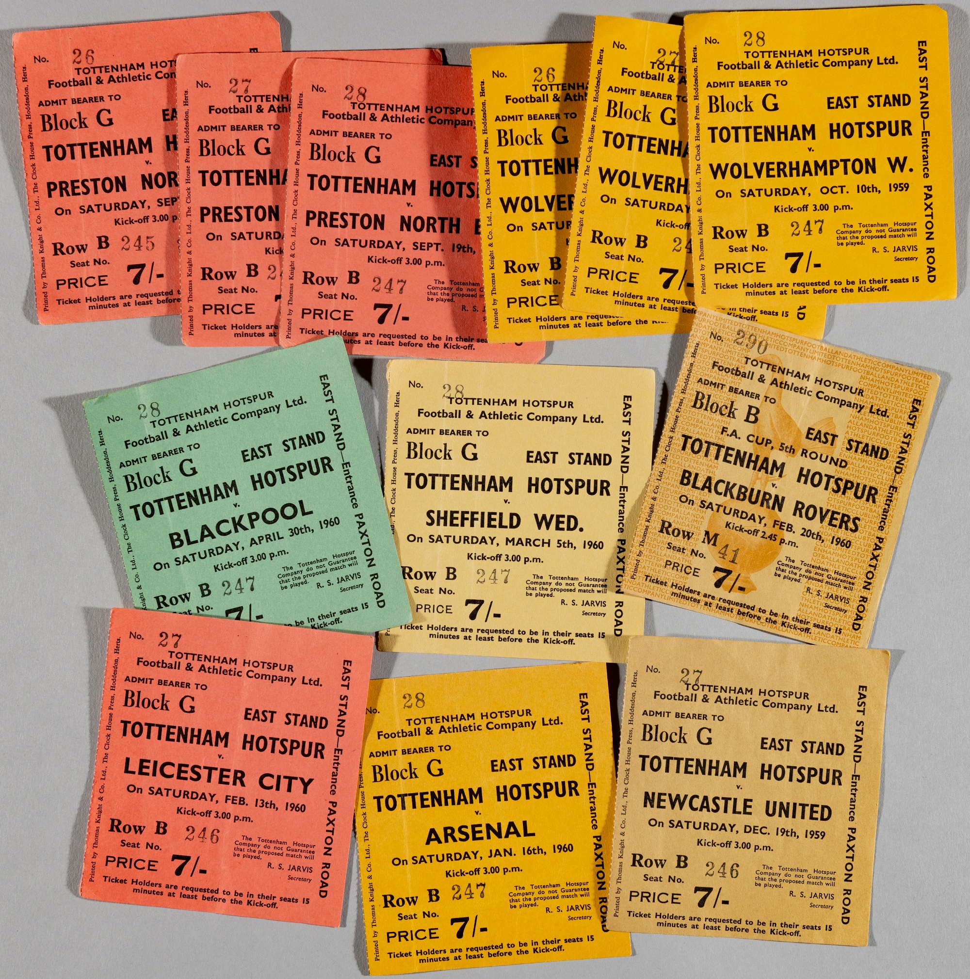 A collection of 28 Tottenham Hotspur home tickets, season 1959-60, some duplication, includes v West Ham United, Chelsea (2), Moscow Torpedo (FR), Blackpool, West Bromwich Albion, Preston North End, Wolverhampton Wanderers, Everton, Manchester City, Arsenal, generally good, some with folding, some paper loss, (28)