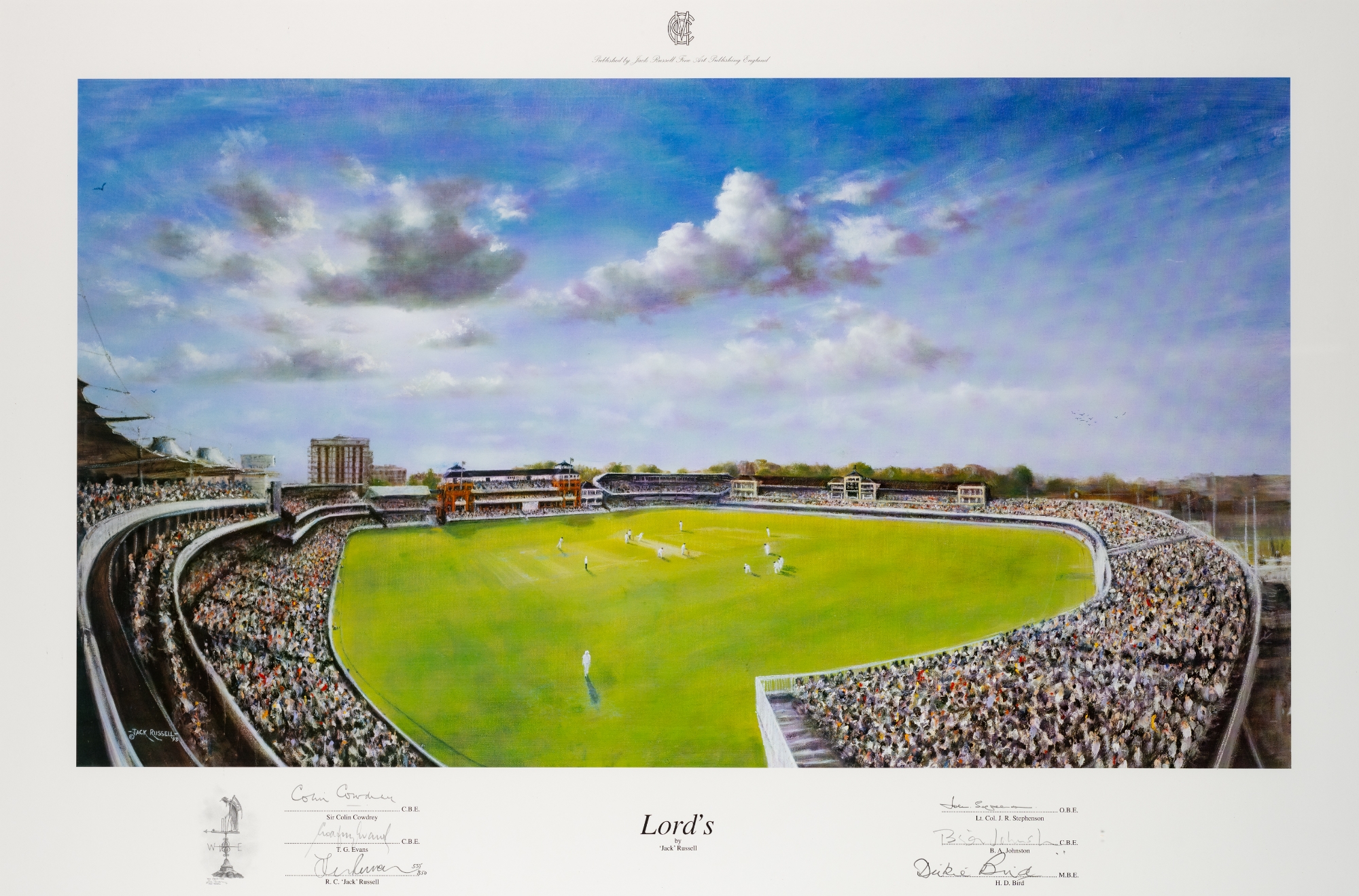 Signed Jack Russell (British, b.1963) colour limited edition print of Lord's Cricket Ground, circa 1993, published by Jack Russell Fine Art Publishing, with a view from the crowds in the stands on a cloudy afternoon, titled 'Lord's', signed by Sir Colin Cowdrey, TG Evans, RC 'Jack' Russell, Lt. Col. J.R. Stephenson, B.A. Jonhston and H.D. Bird, limited edition 555 of 850, glazed and framed, overall 78 by 104cm. Please be aware all glass will be removed from framed and glazed items prior to posting and may result in delays to shipping your items. (This service is included in the cost of postage and packing). We can also totally remove all framing and mounts upon request to reduce shipping costs. Alternatively lots can be collected in person by prior appointment from NN8 1RT.