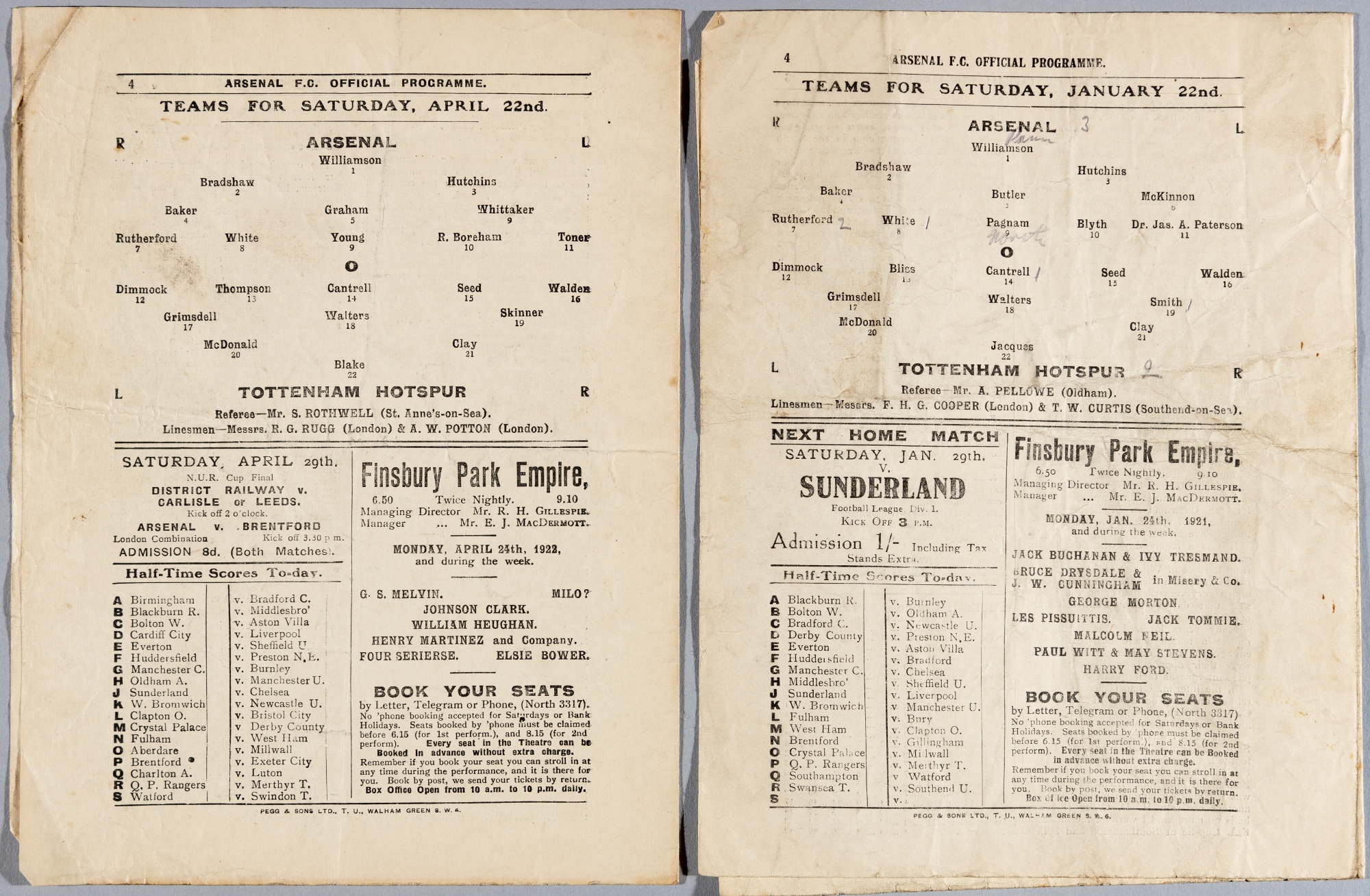 Two Arsenal home programmes v Tottenham Hotspur 1920-21 and 1921-22, each fair with horizontal and vertical folds, grubby, pencil annotations, (2)