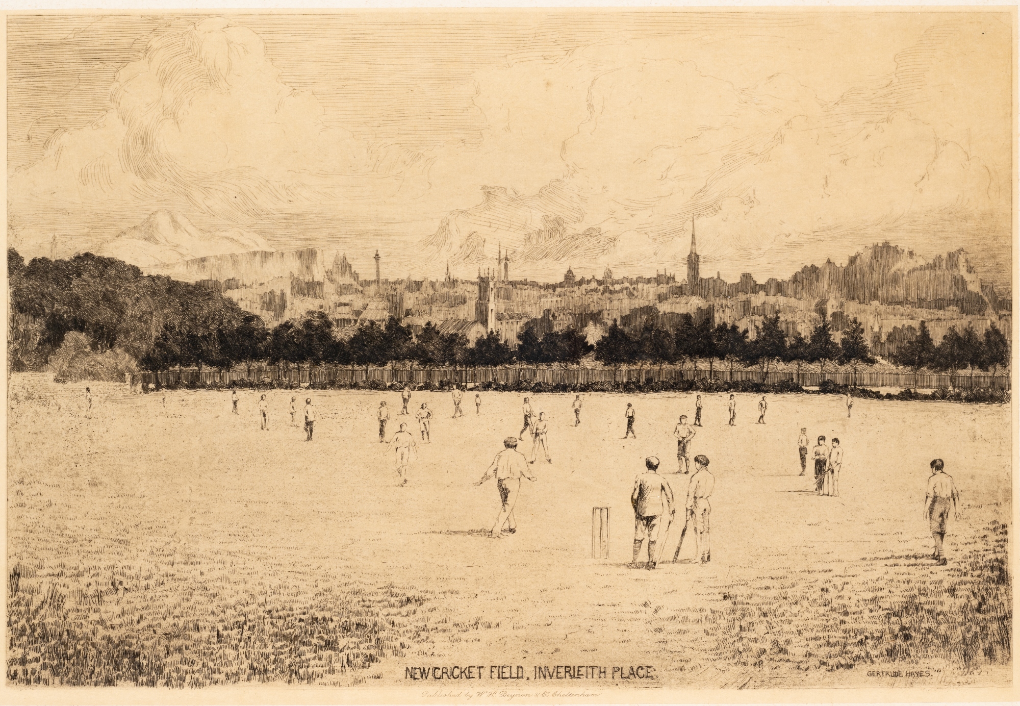 Gertrude Hayes (British, 1872-1956) 'New Cricket Field, Inverleith Place', published by W.H. Benyon & Co., Cheltenham, etching, published circa 1900