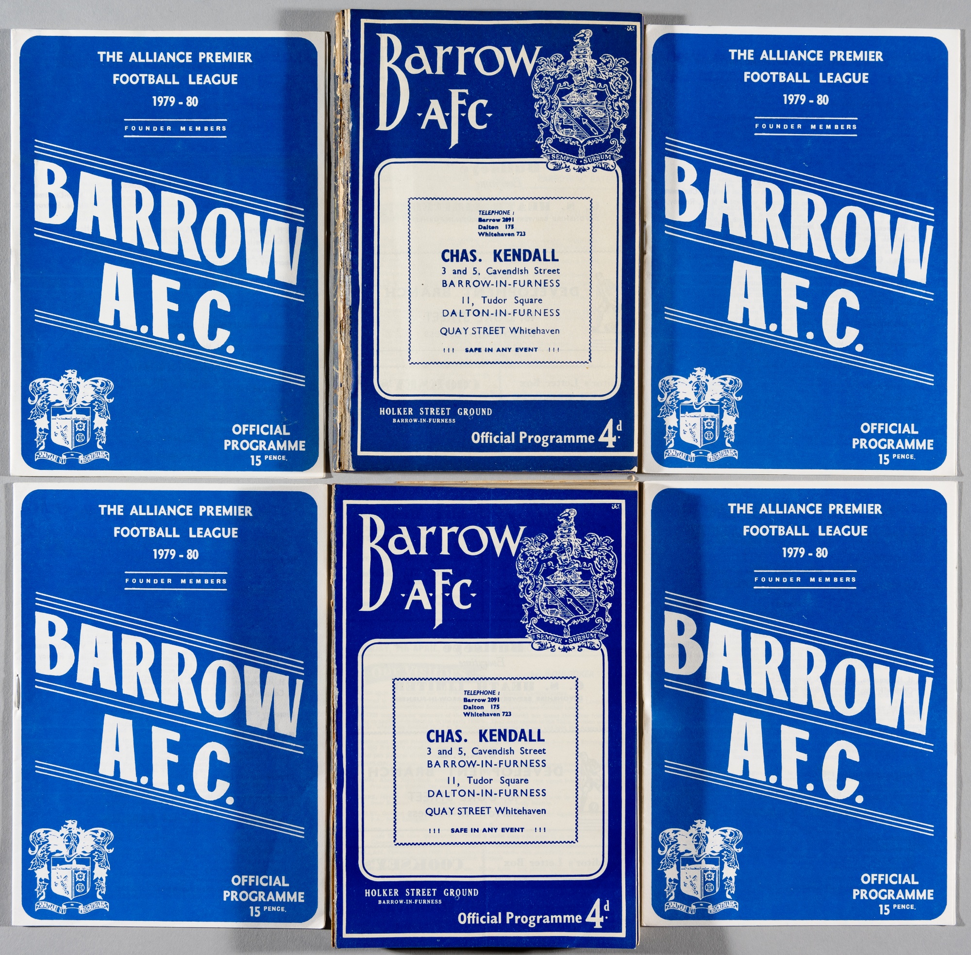 Barrow programme selection includes first season 1972-73, non-league home (18), away (4), first season Alliance Premier 1979-80, home (31), mixed selection home and aways 1952-53 onwards (36) and broken bound volume 1959-60 to 1960-61 (44), majority good with minor wear, some spine marks from bound volume, (total 133)
