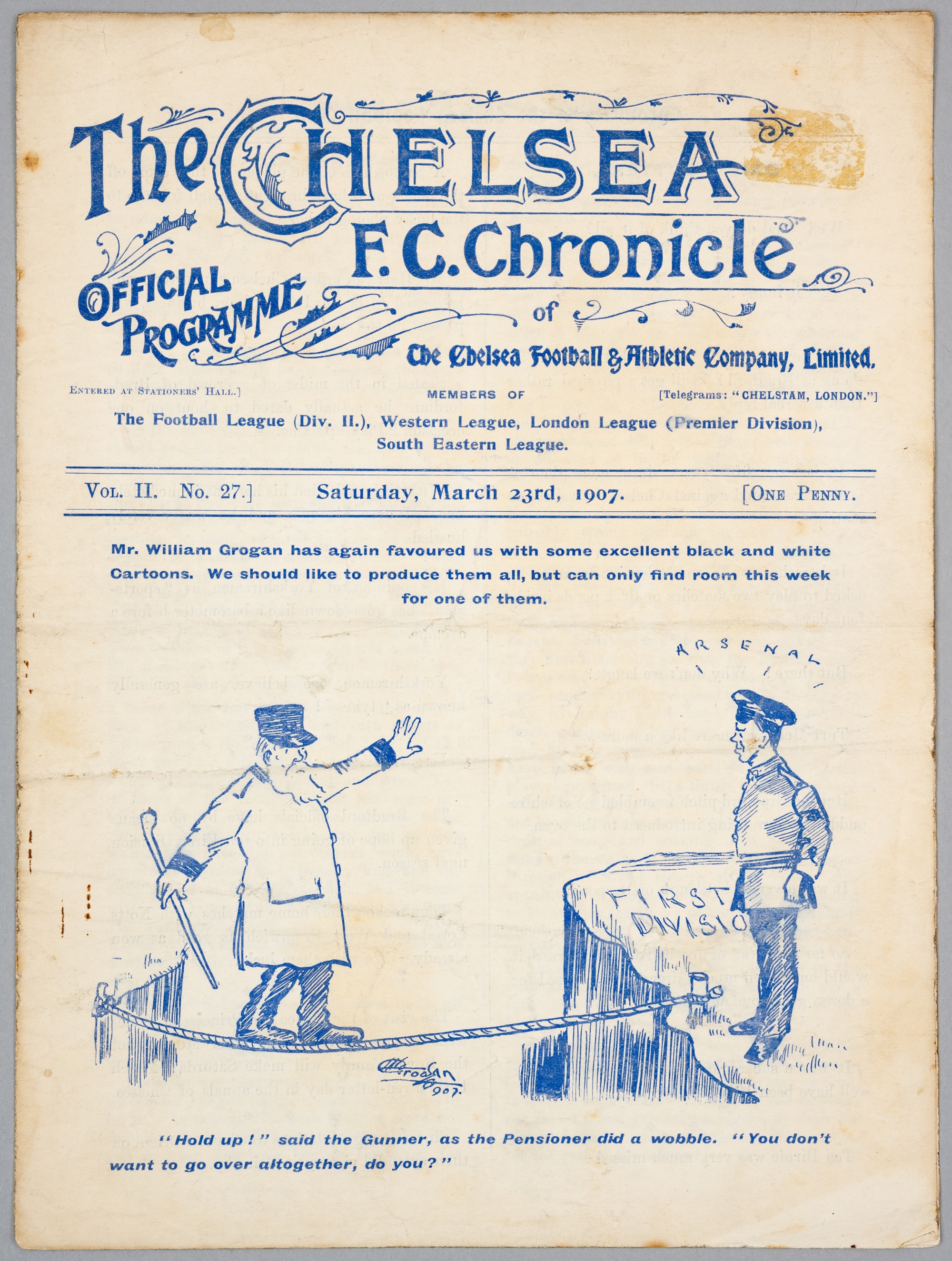 Chelsea v Leeds City programme, 23rd March 1907, 8-page programme with team line-up on reverse, uncut upper page edge, slight discolouration to pages, marks and staining apparent, bears horizontal folds/creases, slight tears to lower spine This programme is from Chelsea's second season as a football club.